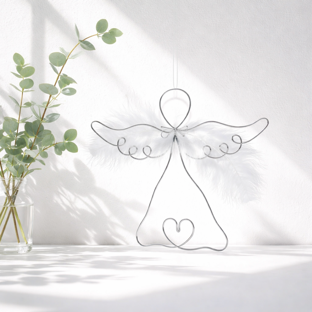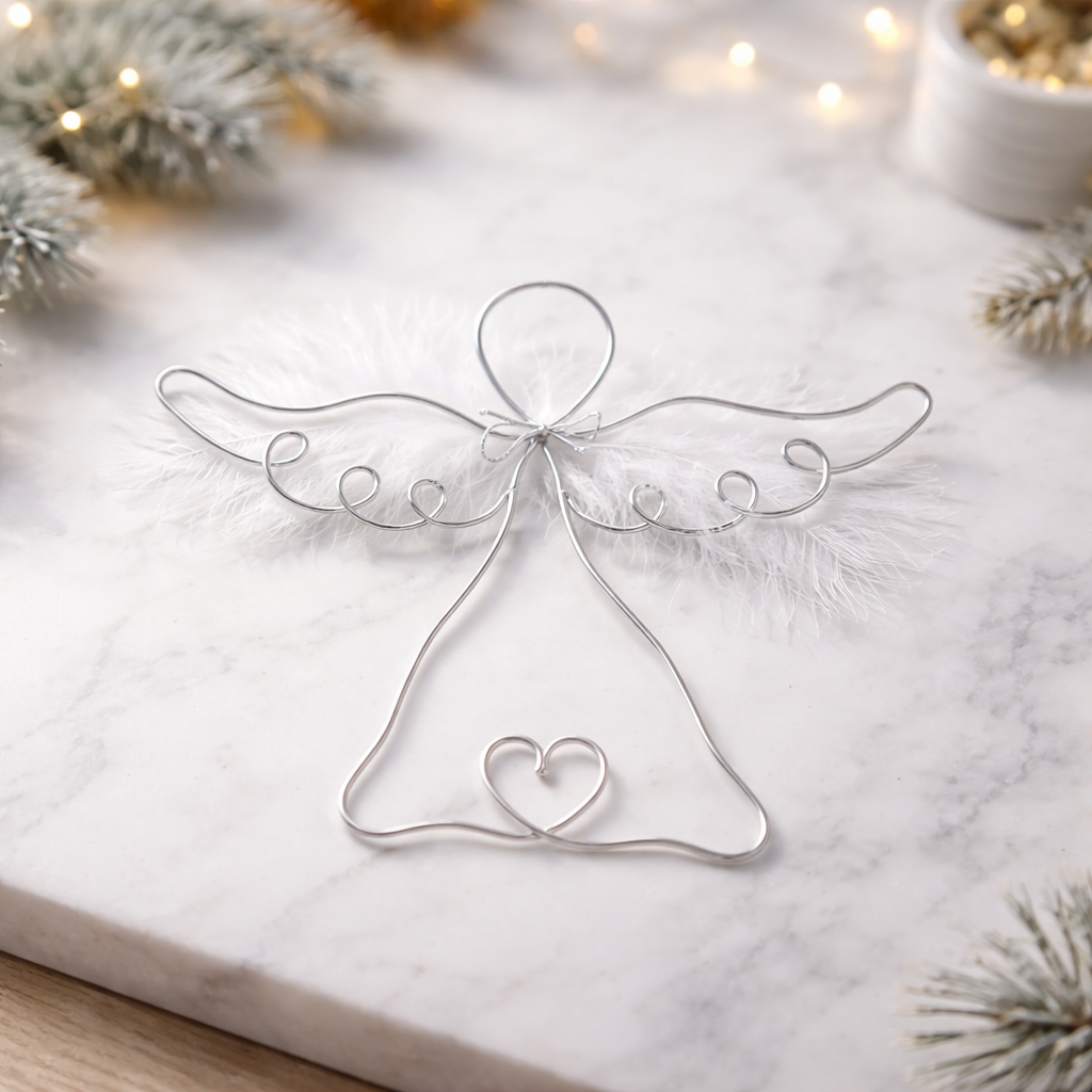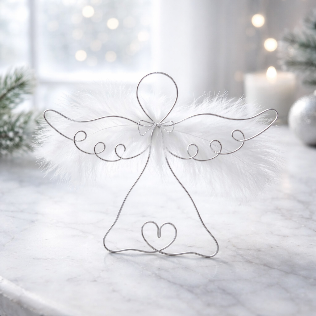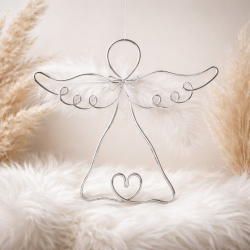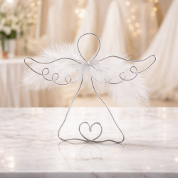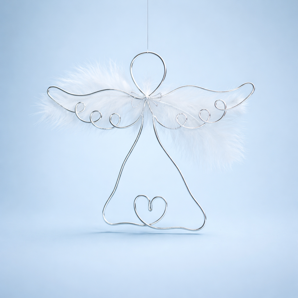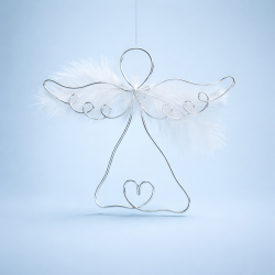 Tento anděl je vytvořen ručně, z hliníkového drátu, doplněn křídly z peříček.