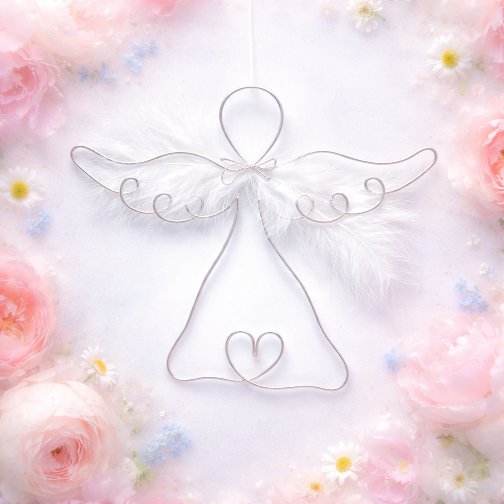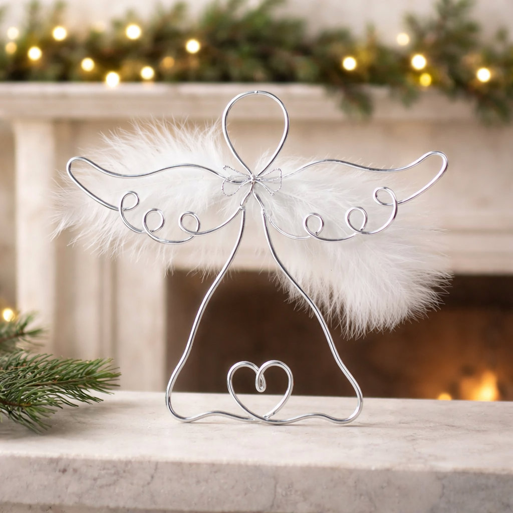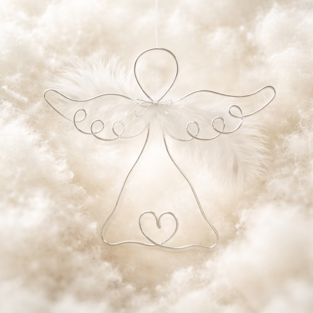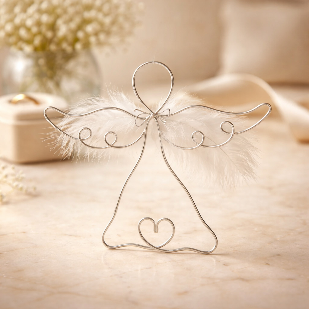 Tento anděl je vytvořen ručně, z hliníkového drátu, doplněn křídly z peříček.