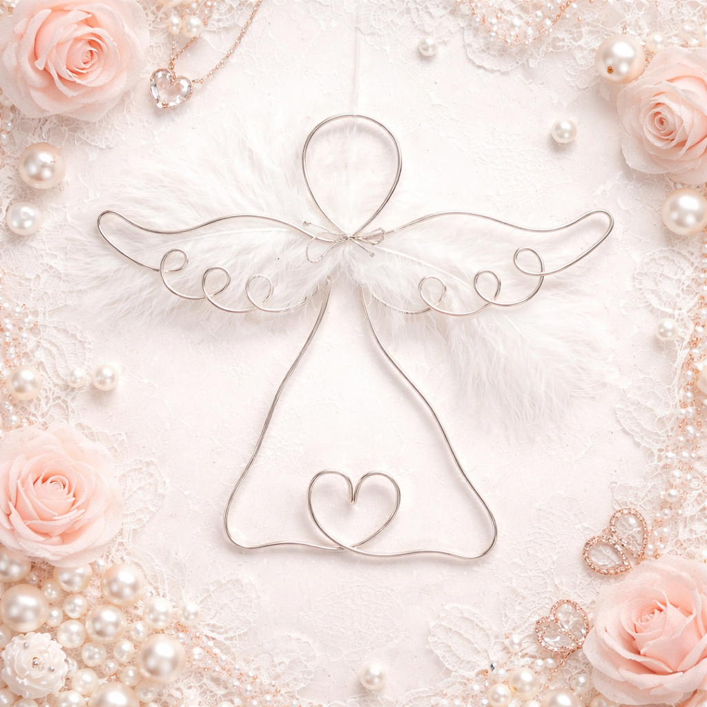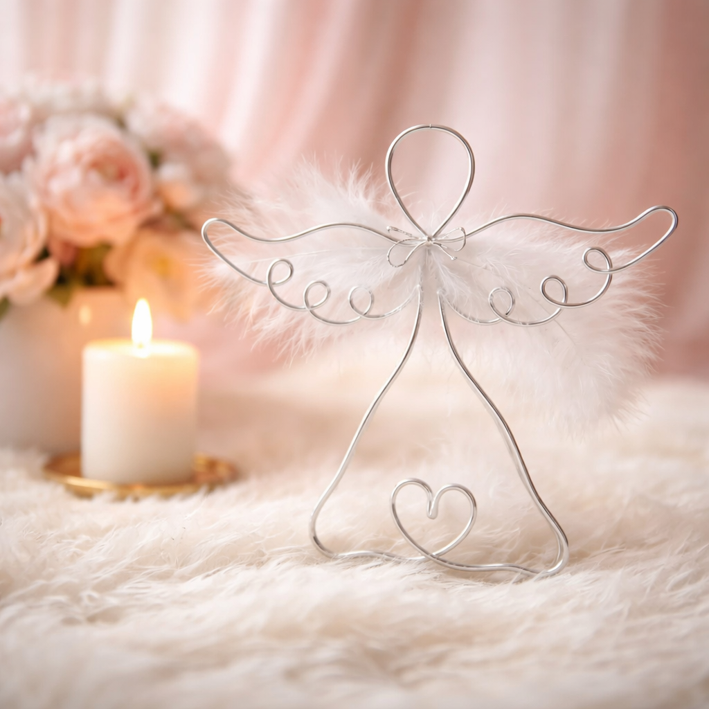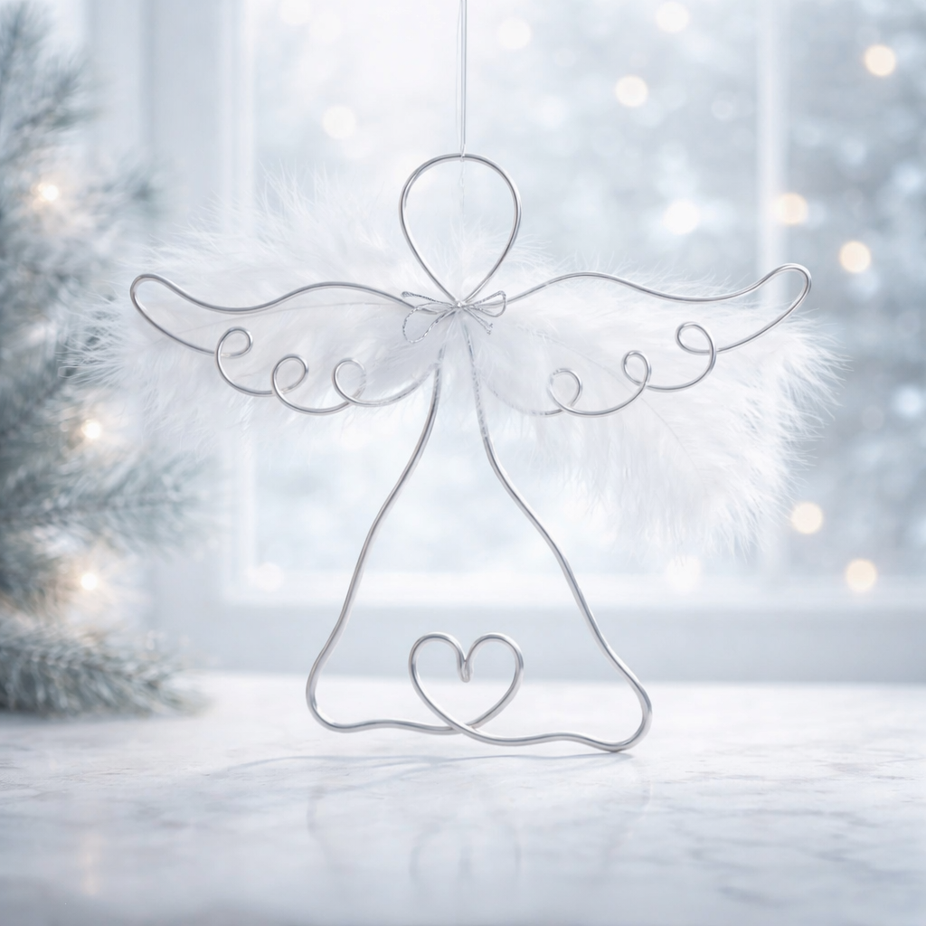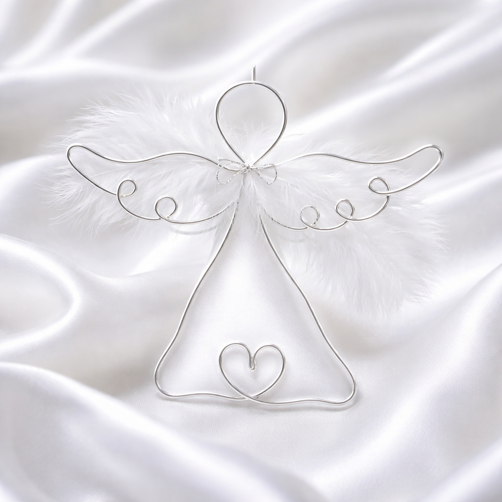 Tento anděl je vytvořen ručně, z hliníkového drátu, doplněn křídly z peříček.