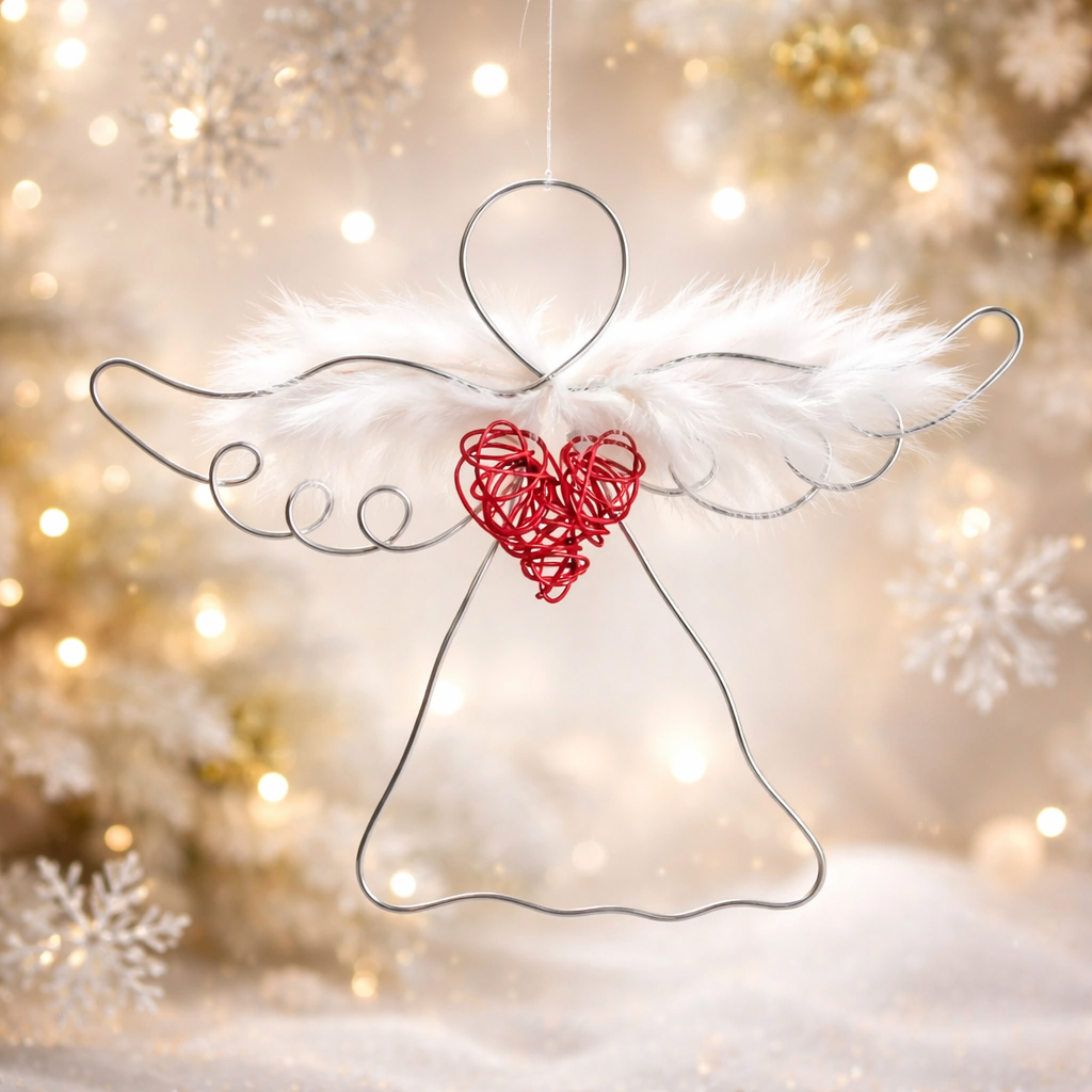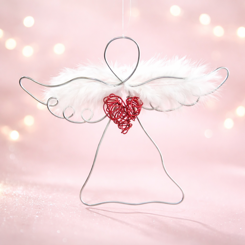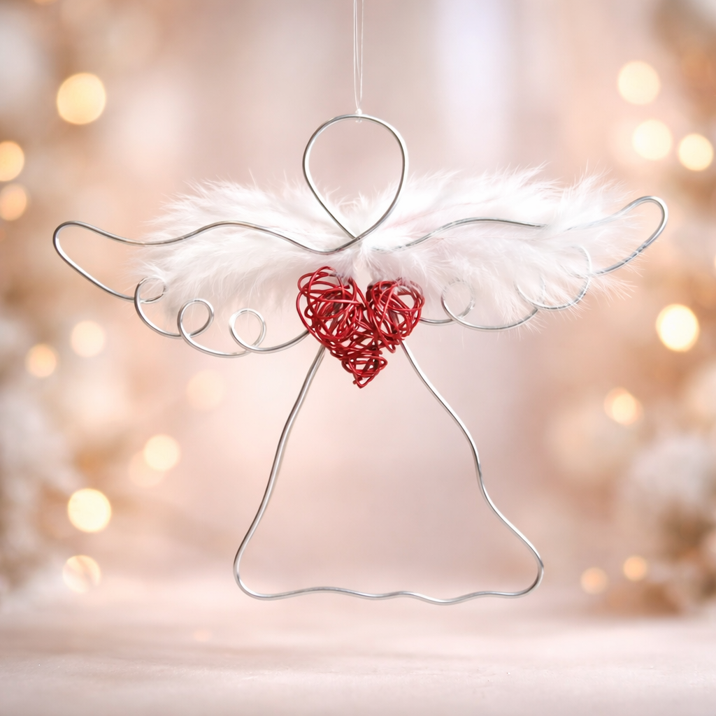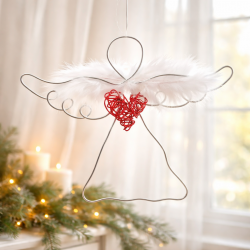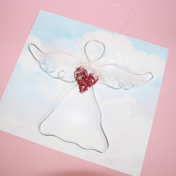 Tento anděl je vytvořen ručně, z hliníkového drátu, doplněn křídly z peříček a uprostřed se srdcem.