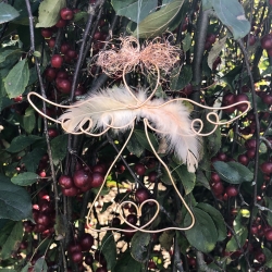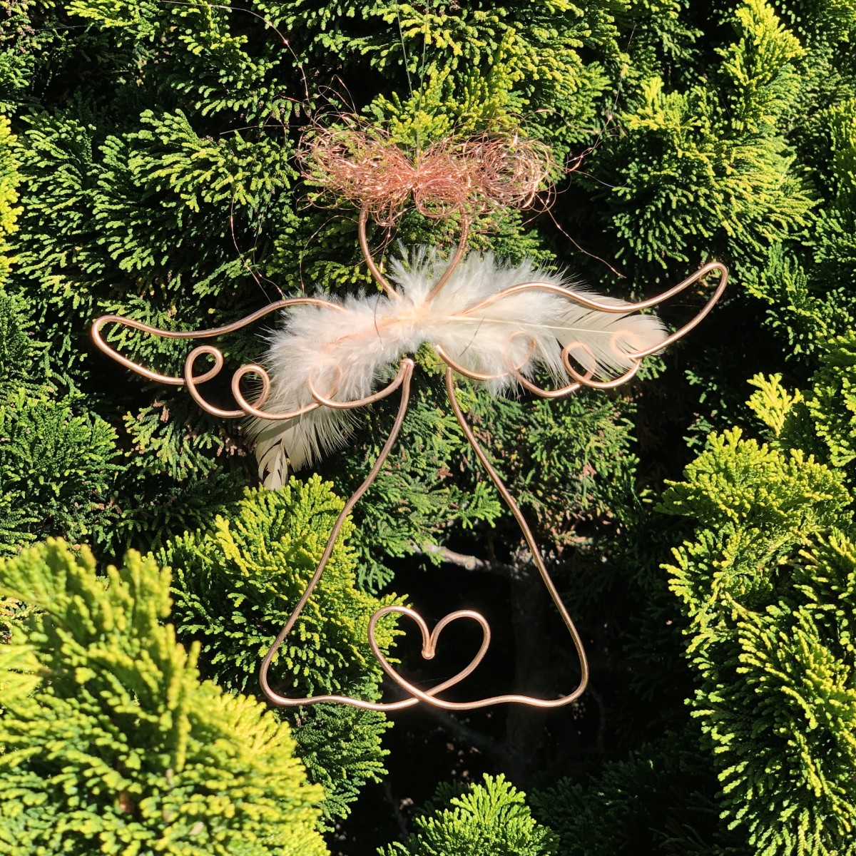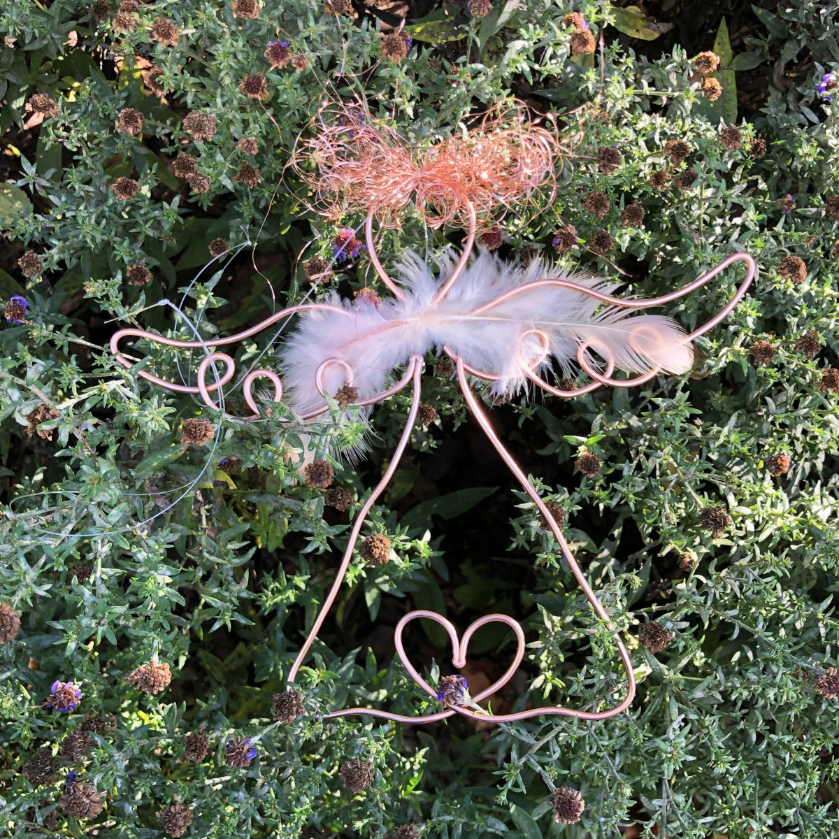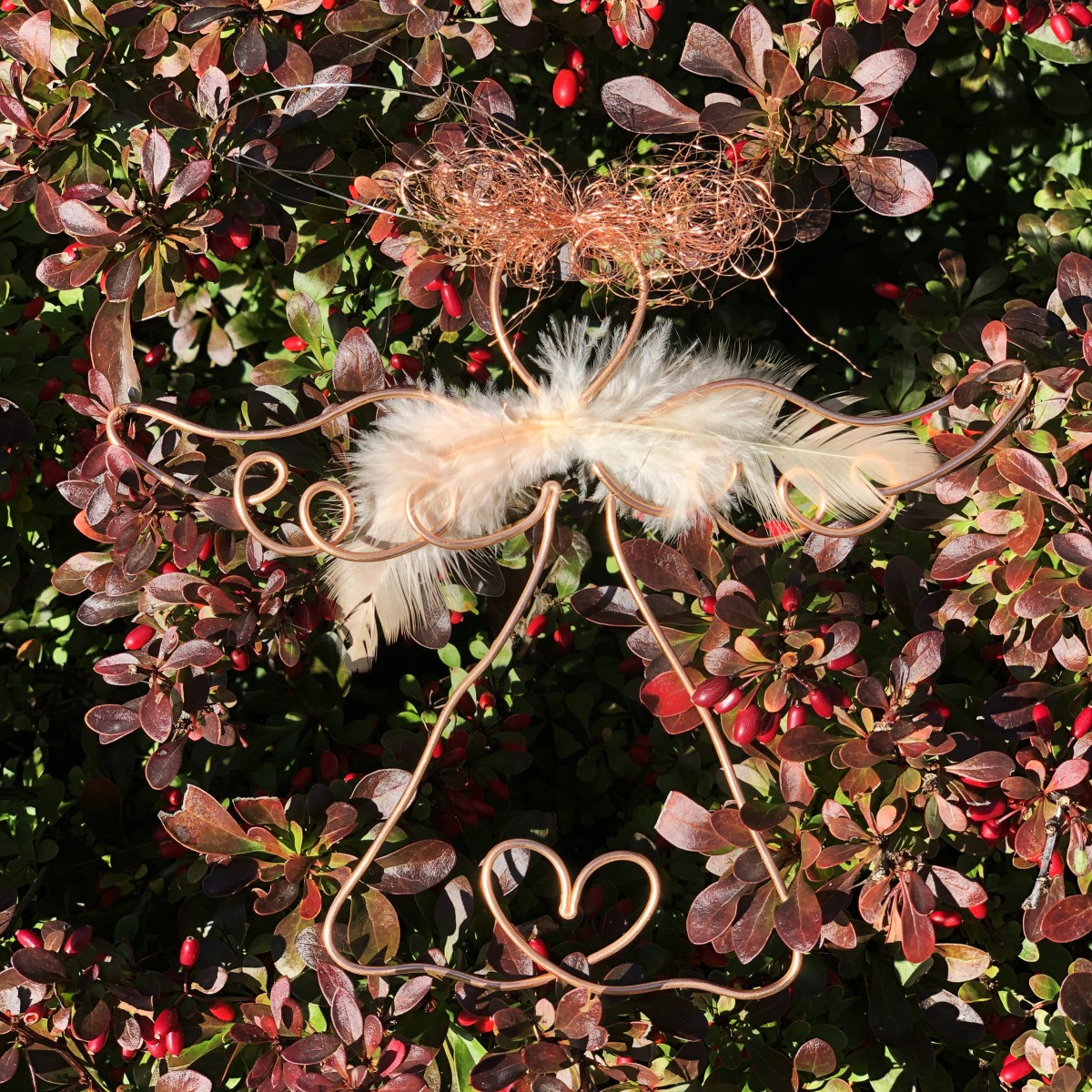 Tento anděl je vytvořen ručně, z hliníkového drátu, doplněn křídly z peříček a andělskými vlasy v měděné barvě.