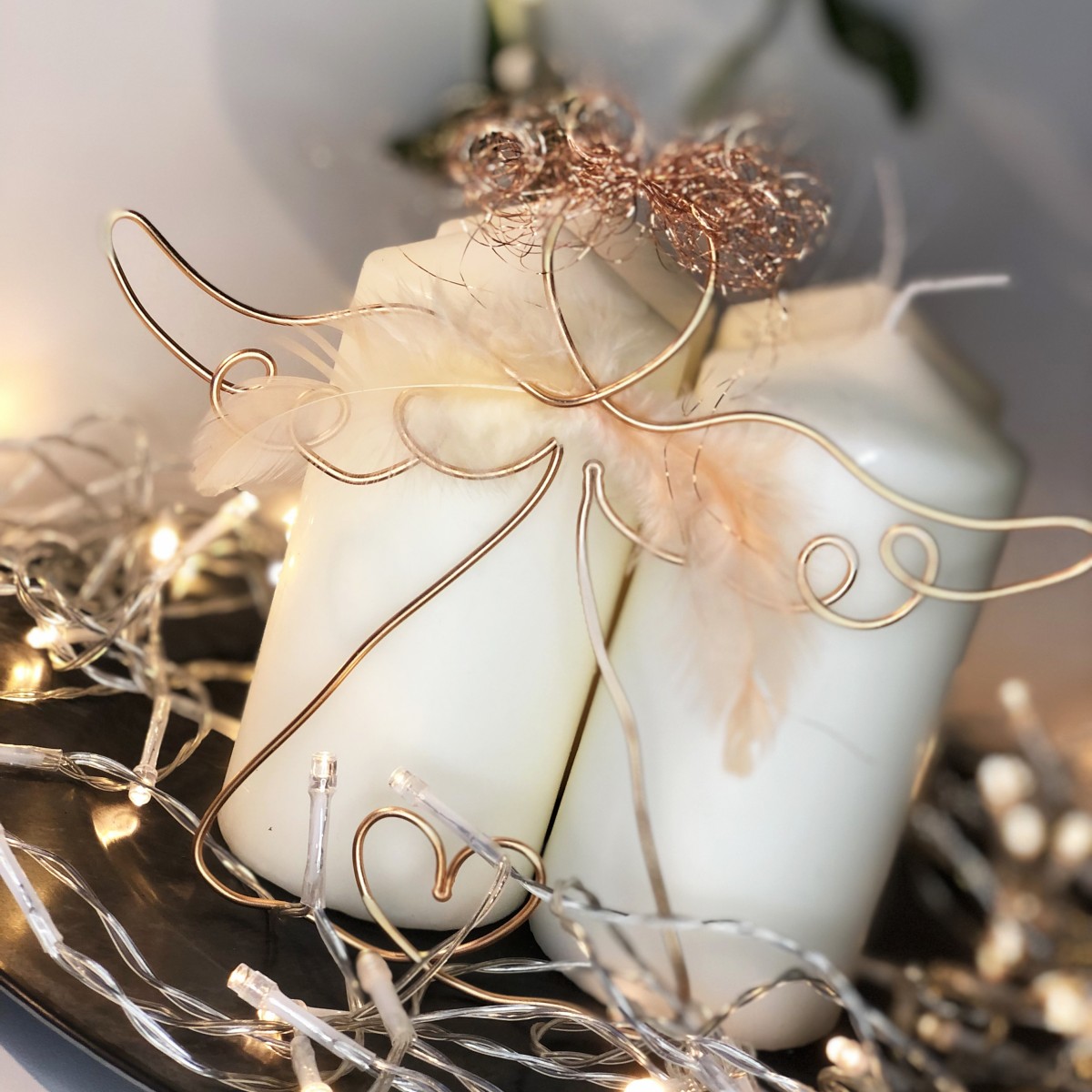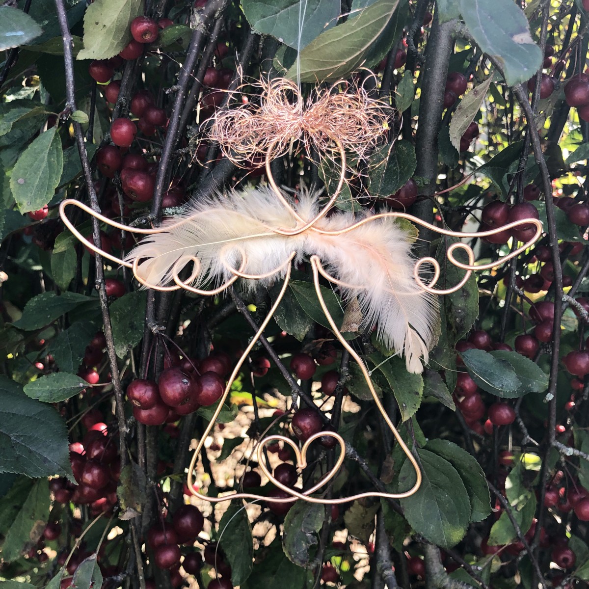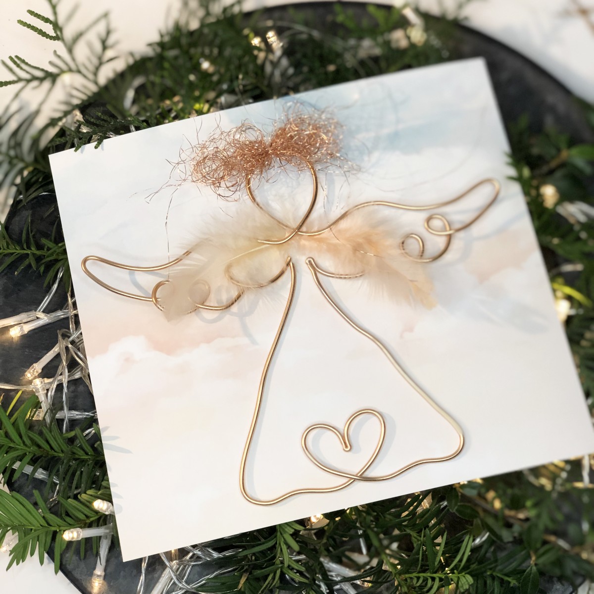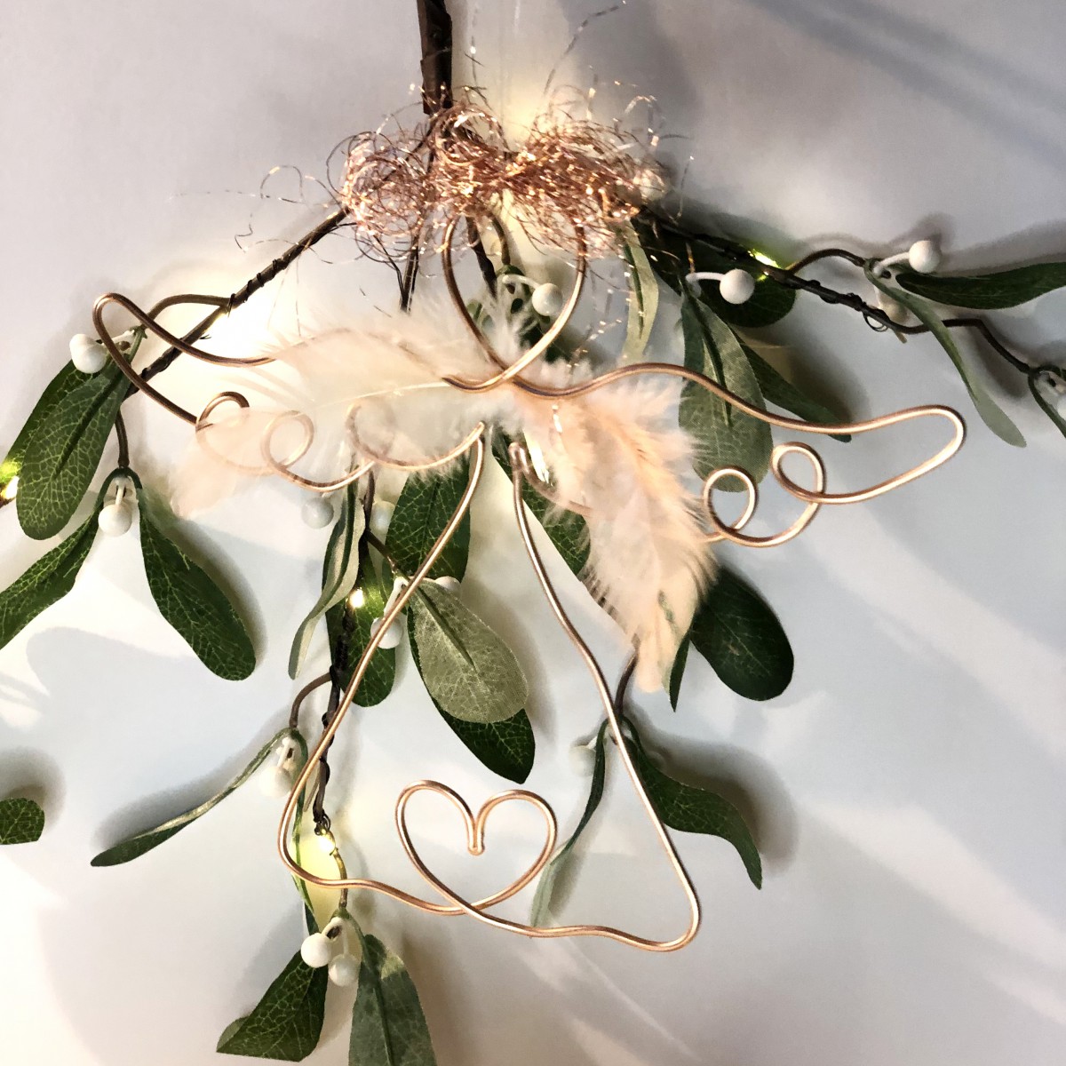 Tento anděl je vytvořen ručně, z hliníkového drátu, doplněn křídly z peříček a andělskými vlasy v měděné barvě.
