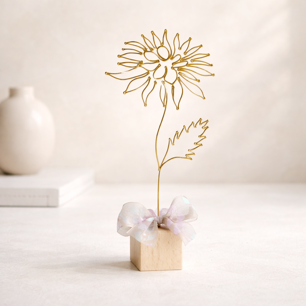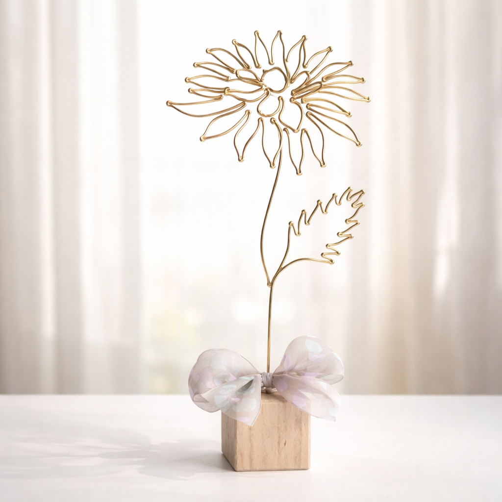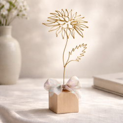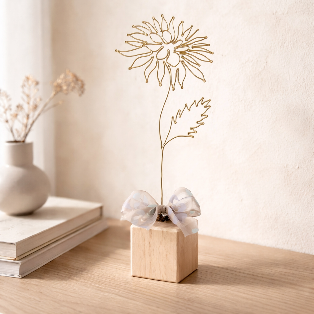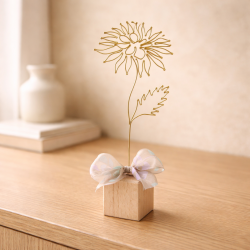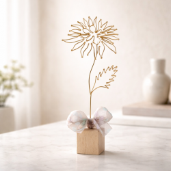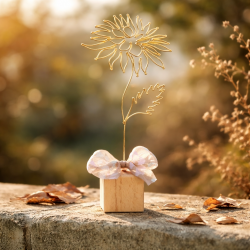 Chryzantéma je připevněna na dřevěné kostce a tvoří tak samostatně stojící dekoraci. Dozdobena je stuhou.