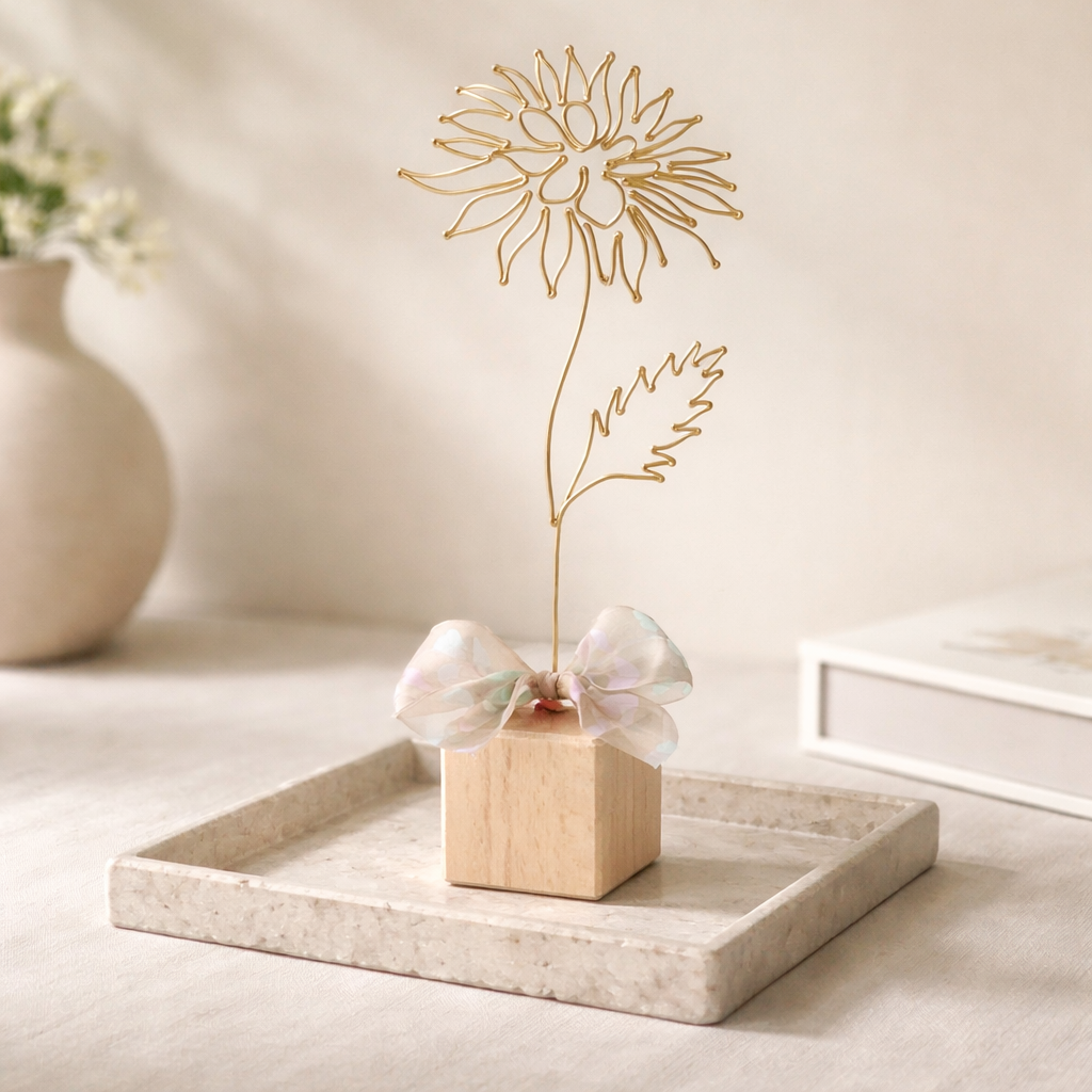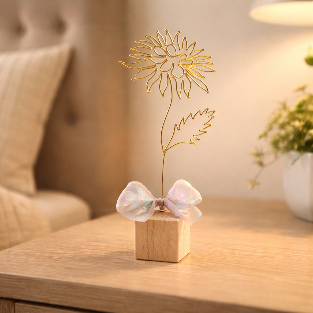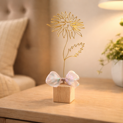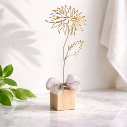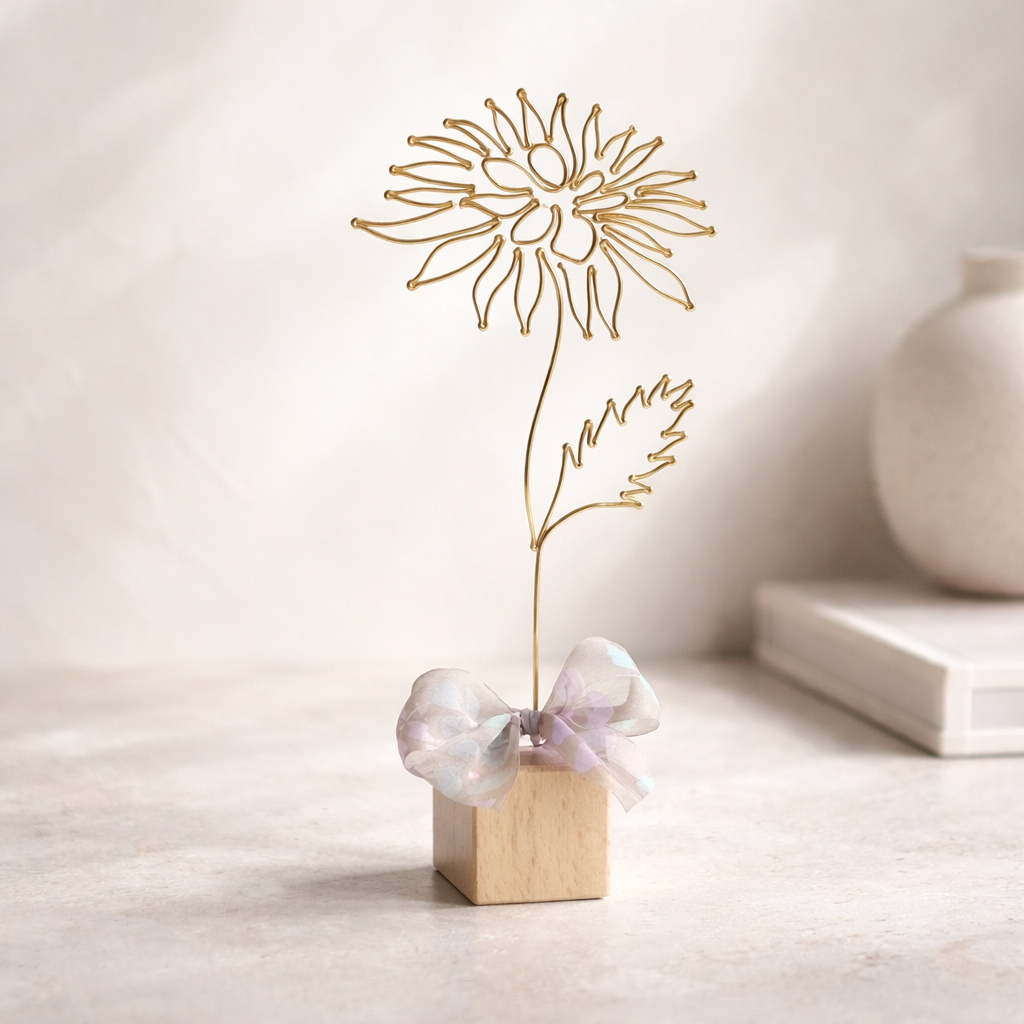 Chryzantéma je připevněna na dřevěné kostce a tvoří tak samostatně stojící dekoraci. Dozdobena je stuhou.