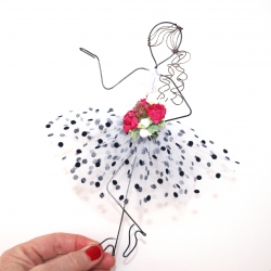 DÁMIČKA Z DRÁTU .... bílá s černými puntíky a purpurovou kyticí