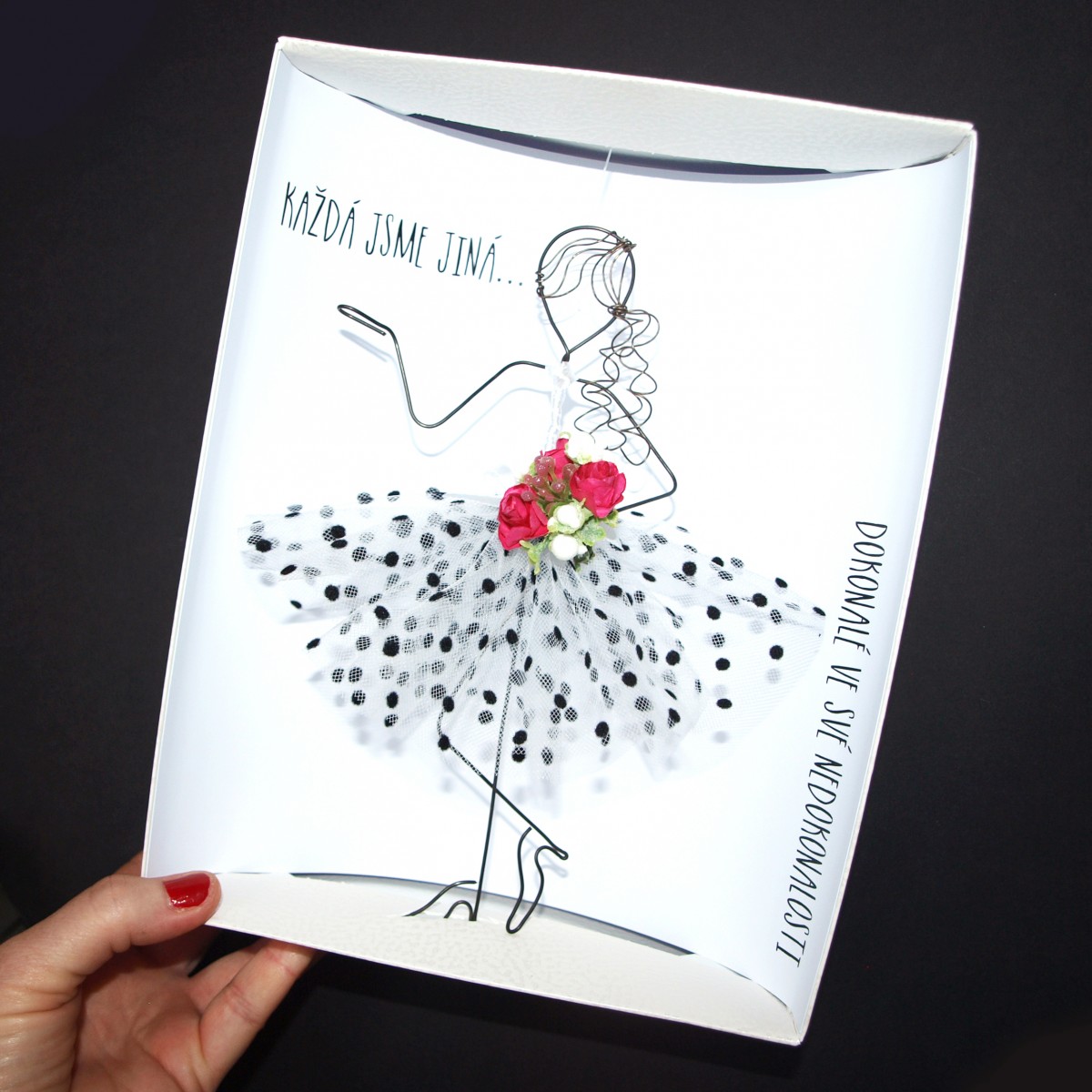 KAŽDÁ JSME JINÁ... DOKONALÉ VE SVÉ NEDOKONALOSTI... přesně o tom to je. Tak jako ručně vytvořená dámička z drátu může působit nedokonale, tak se občas cítí každá z nás. Dámička je vysoká 20 cm, umístěná do dárkové krabici s tímto sloganem.