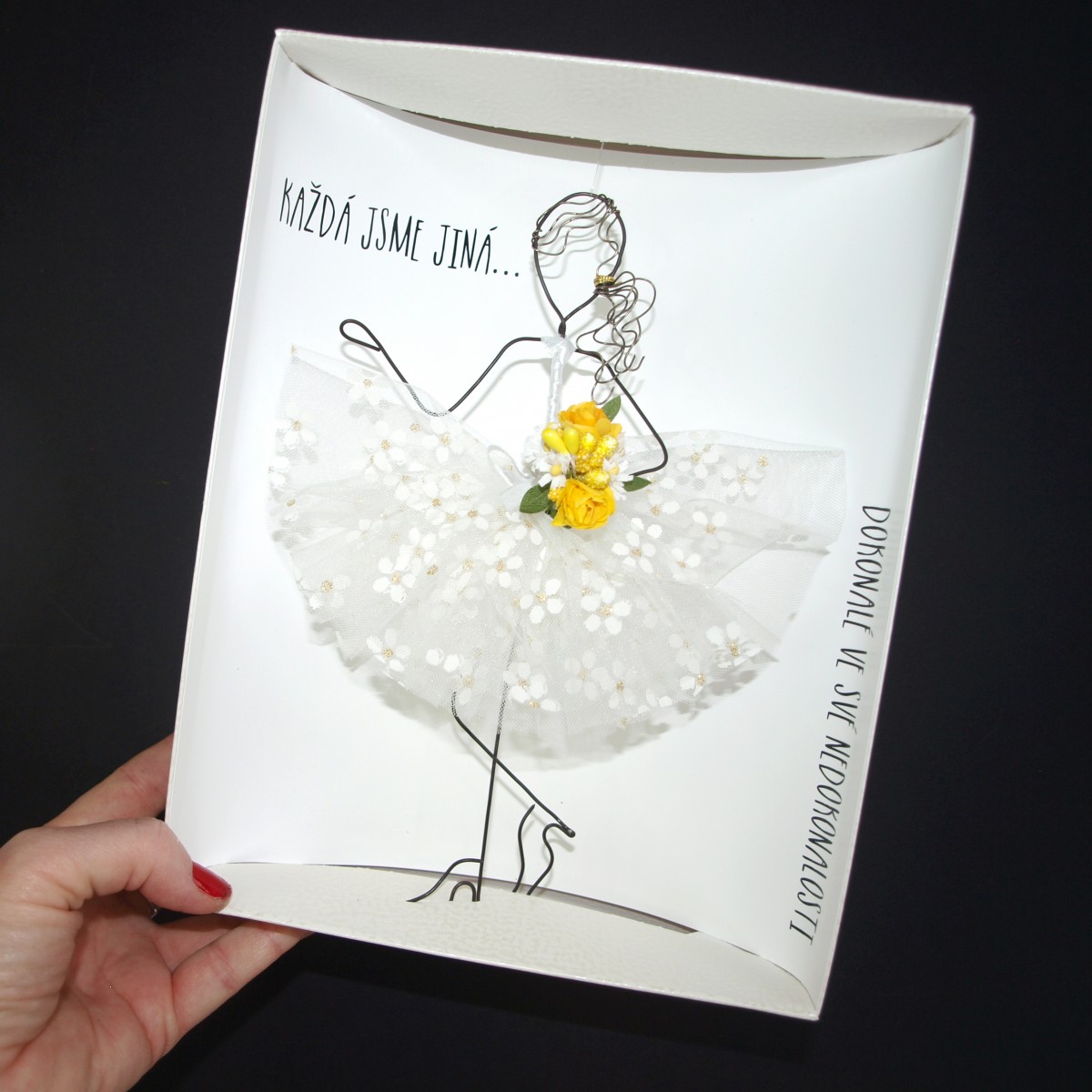 KAŽDÁ JSME JINÁ... DOKONALÉ VE SVÉ NEDOKONALOSTI... přesně o tom to je. Tak jako ručně vytvořená dámička z drátu může působit nedokonale, tak se občas cítí každá z nás. Dámička je vysoká 20 cm, umístěná do dárkové krabici s tímto sloganem.
