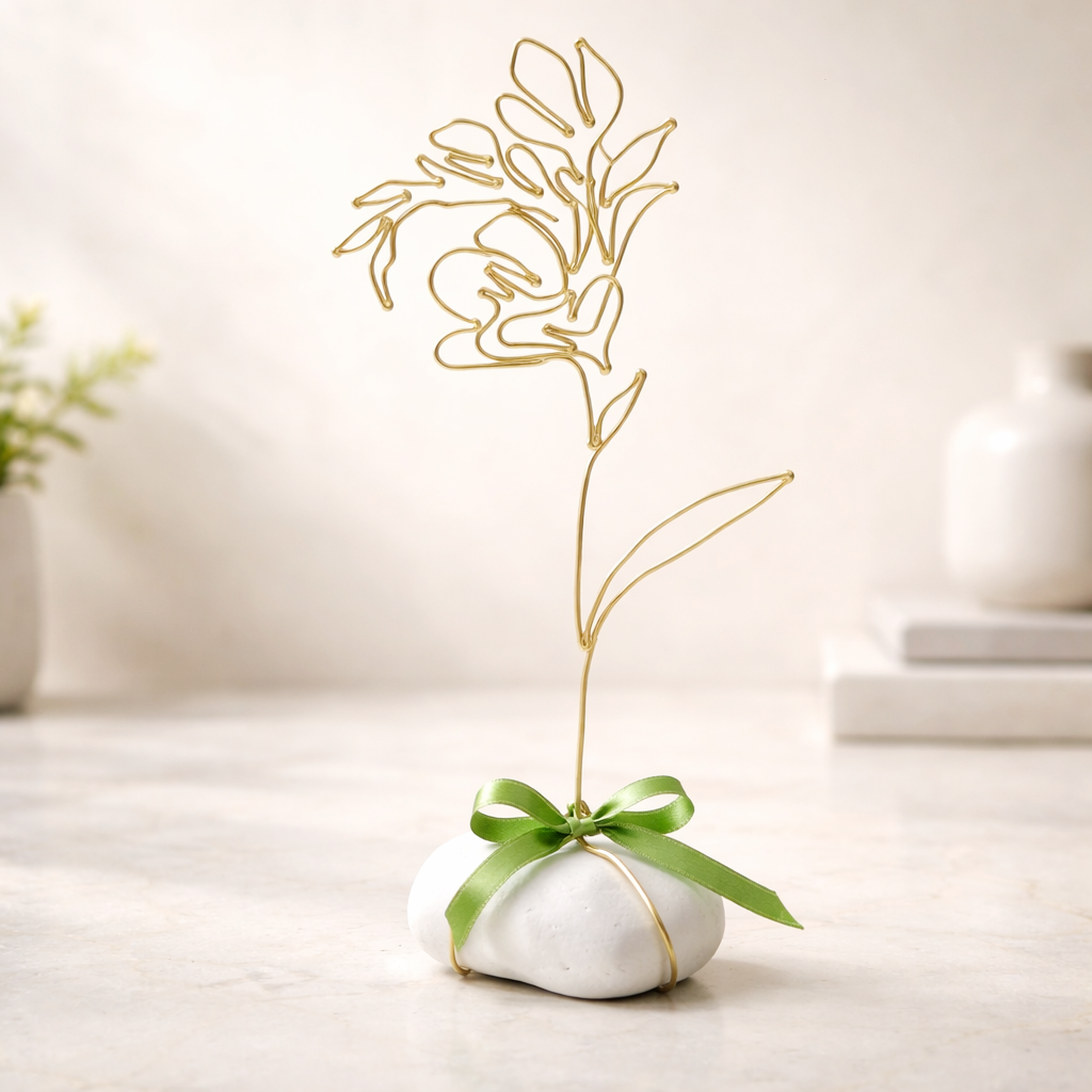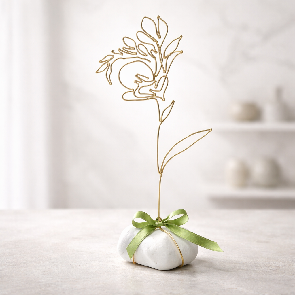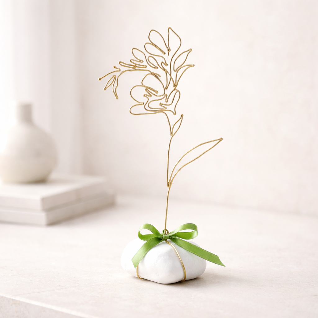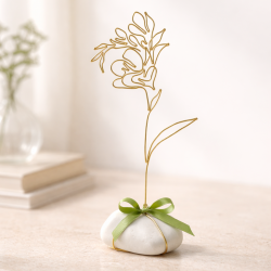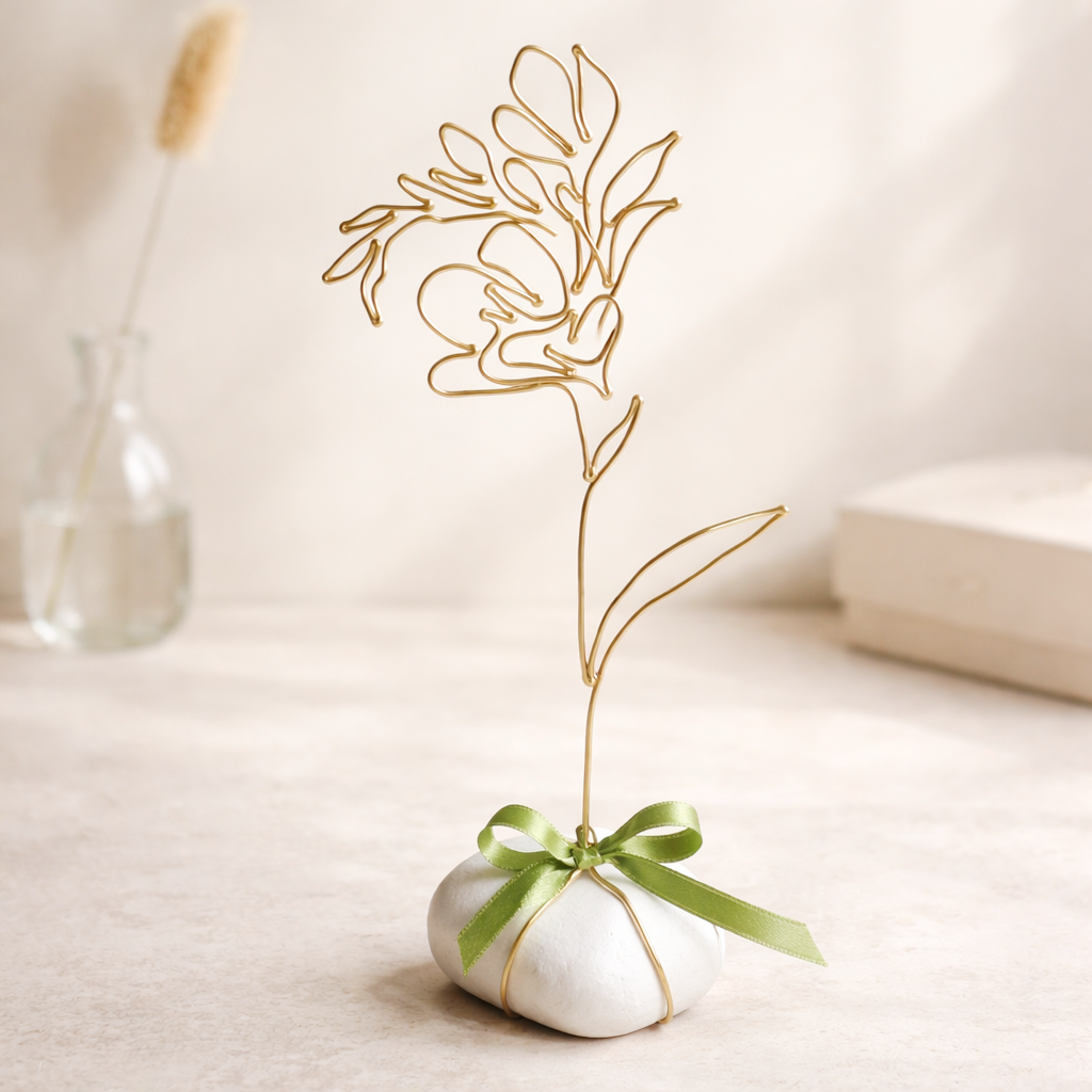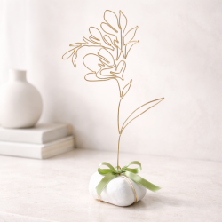 Frézie je připevněna na bílém oblázku, doplněno stuhou a tvoří tak samostatně stojící dekoraci.