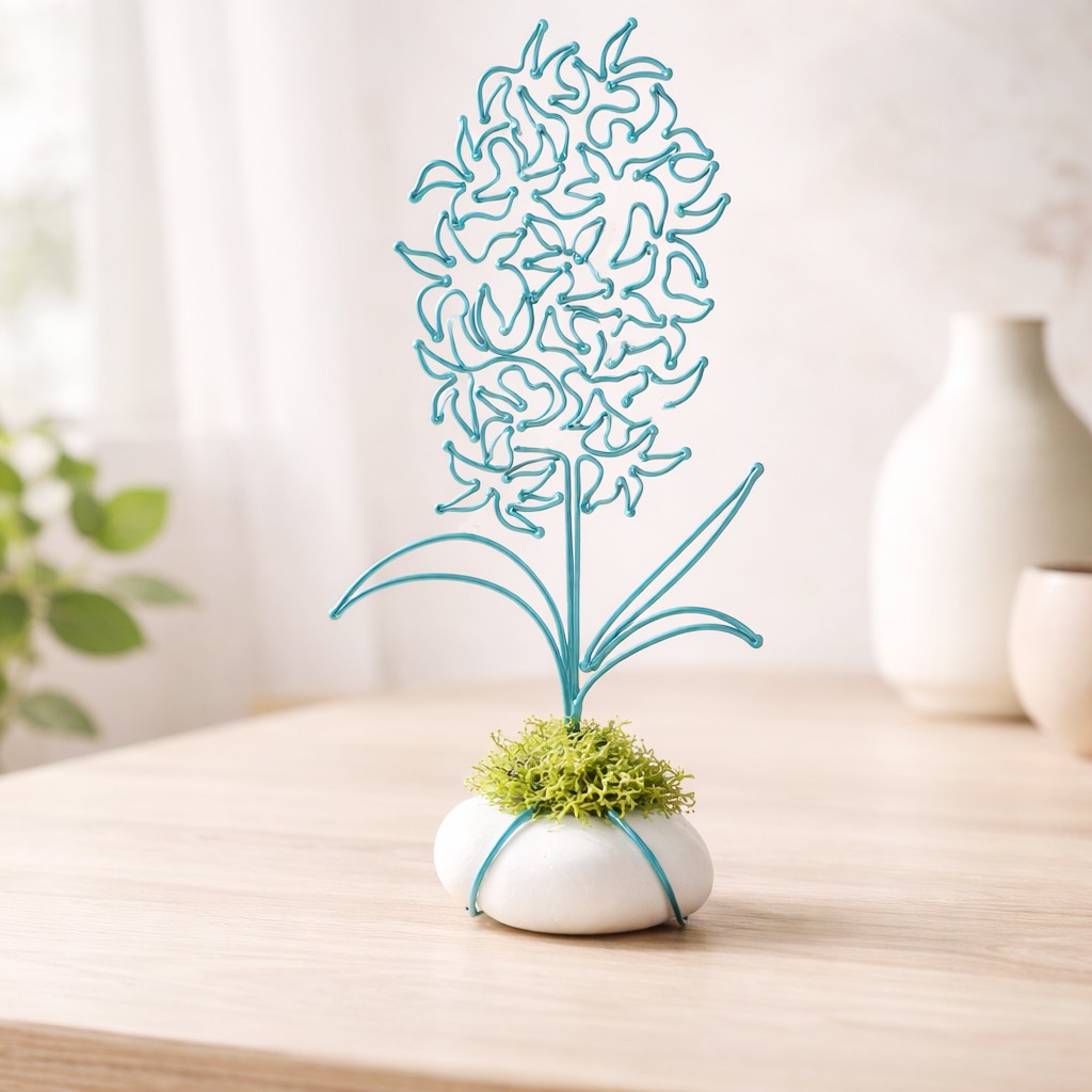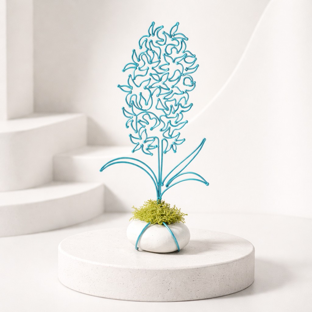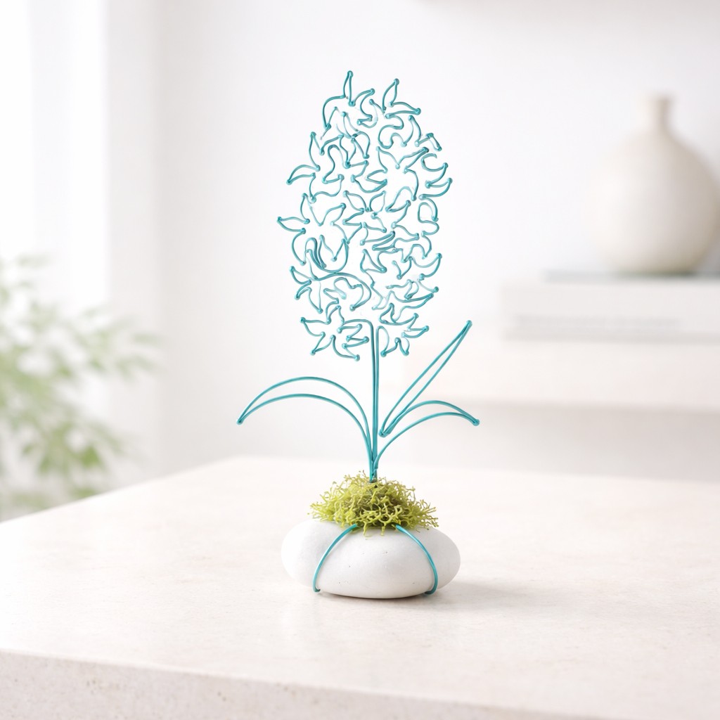 Hyacint je připevněn na bílém oblázku, doplněné mechem a tvoří tak samostatně stojící dekoraci.