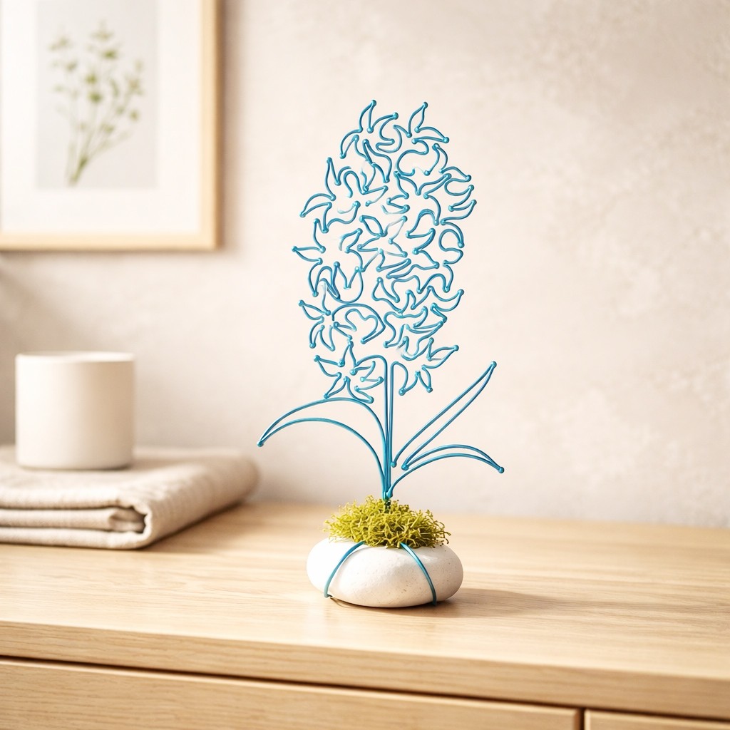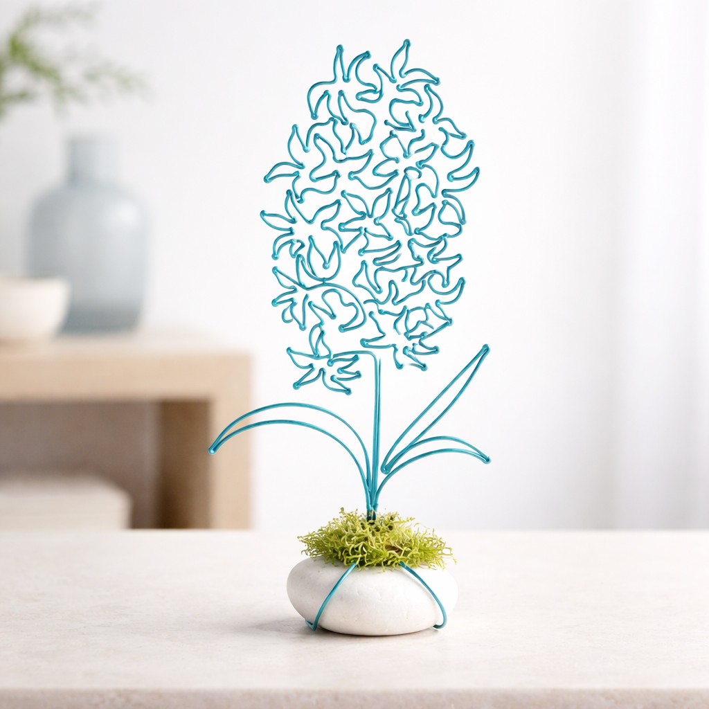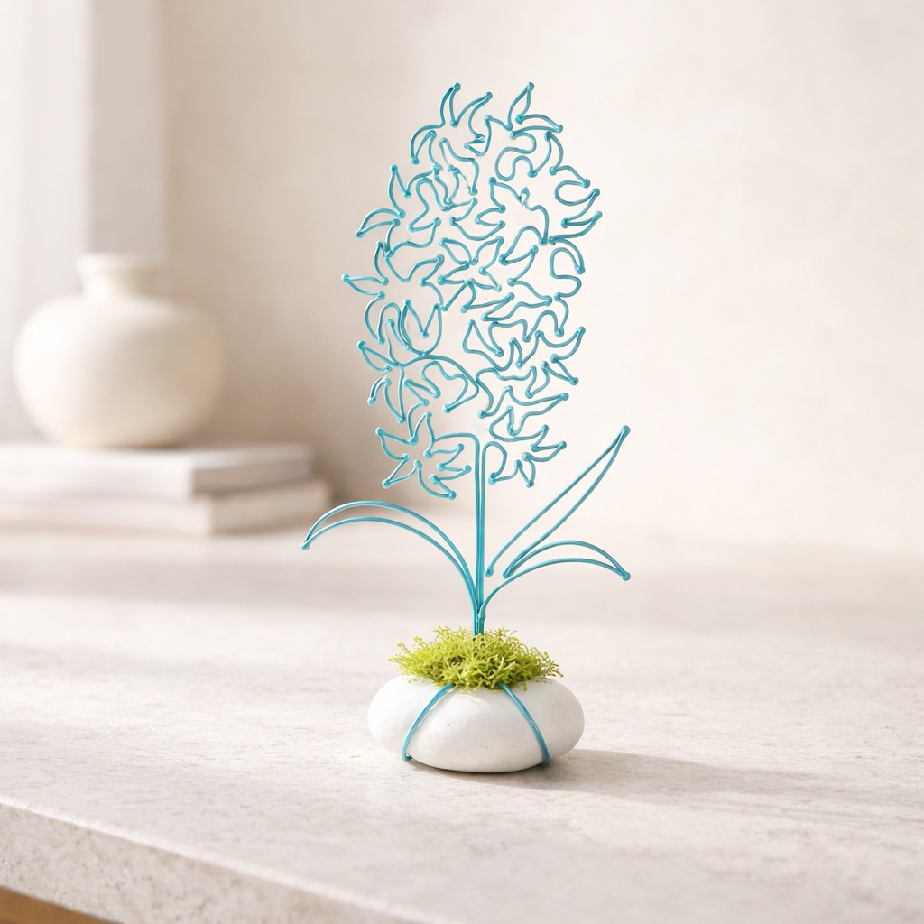 Hyacint je připevněn na bílém oblázku, doplněné mechem a tvoří tak samostatně stojící dekoraci.