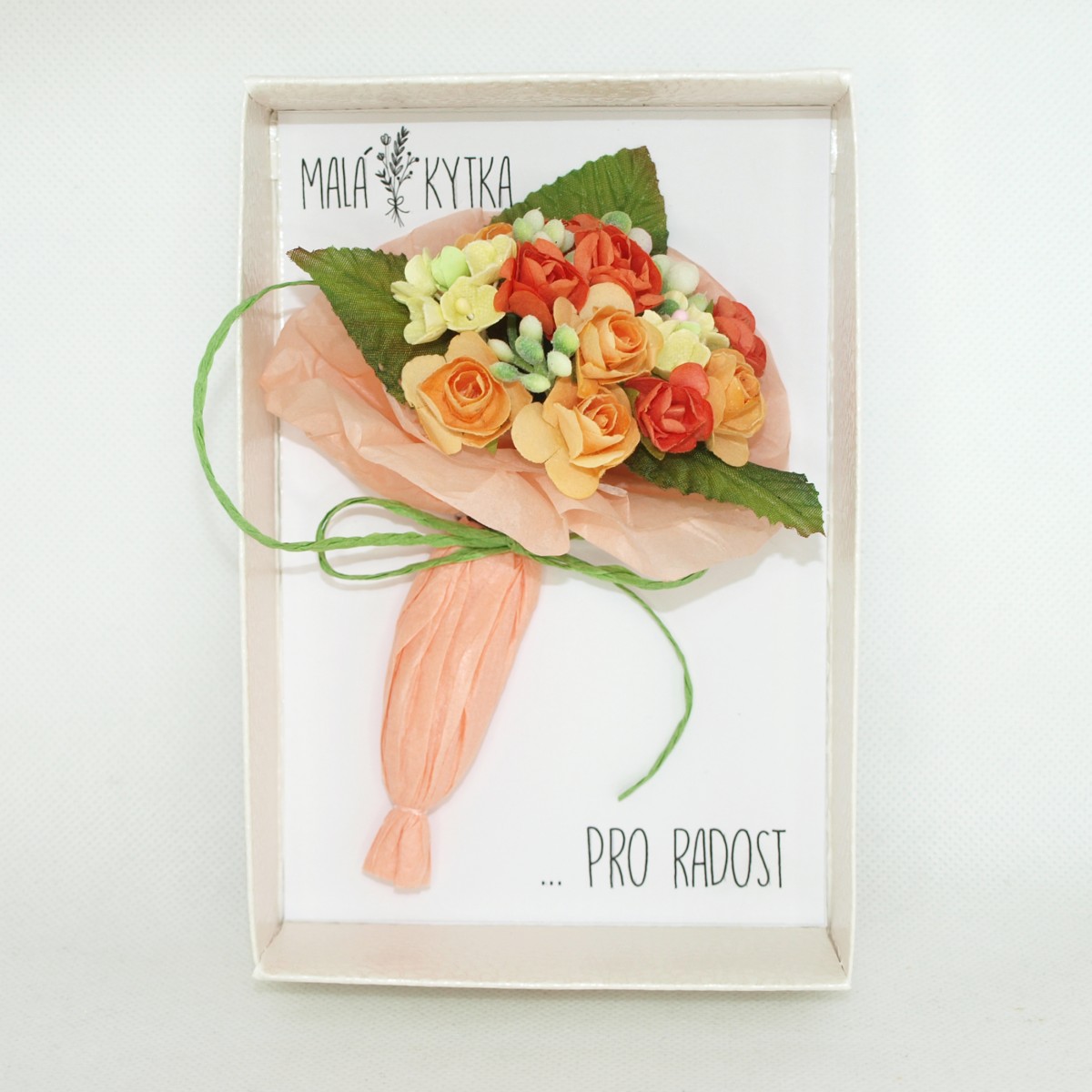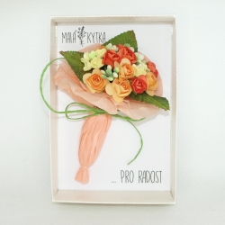 Malá kytka... mini kytička v papírové krabiččce v imitaci bílé kůže, s průhledným uzavíráním. Kytička je vytvořena z čistě přírodních materiálů, převážně z papíru a hedvábí. Je to ideální "maličkost pro radost" k různým příležitostem, ať už pro potěšení kamarádce, mamince, babičce, pro paní doktorku, učitelku, do porodnice, nebo komukoliv, komu chcete poděkovat, potěšit. je to maličkost, která potěší, ale nezavazuje. Dá se také poslat v bublinkové obálce jako psaní, komukoliv, když nemůžete předat osobně. Stačí napsat a my vše zařídíme za vás...