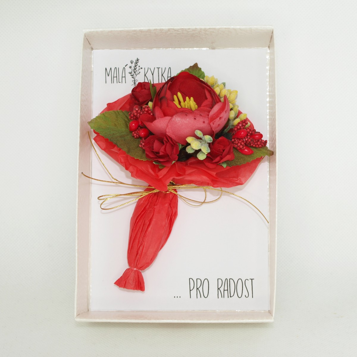 Malá kytka... mini kytička v papírové krabiččce v imitaci bílé kůže, s průhledným uzavíráním. Kytička je vytvořena z čistě přírodních materiálů, převážně z papíru a hedvábí. Je to ideální "maličkost pro radost" k různým příležitostem, ať už pro potěšení kamarádce, mamince, babičce, pro paní doktorku, učitelku, do porodnice, nebo komukoliv, komu chcete poděkovat, potěšit. je to maličkost, která potěší, ale nezavazuje. Dá se také poslat v bublinkové obálce jako psaní, komukoliv, když nemůžete předat osobně. Stačí napsat a my vše zařídíme za vás...