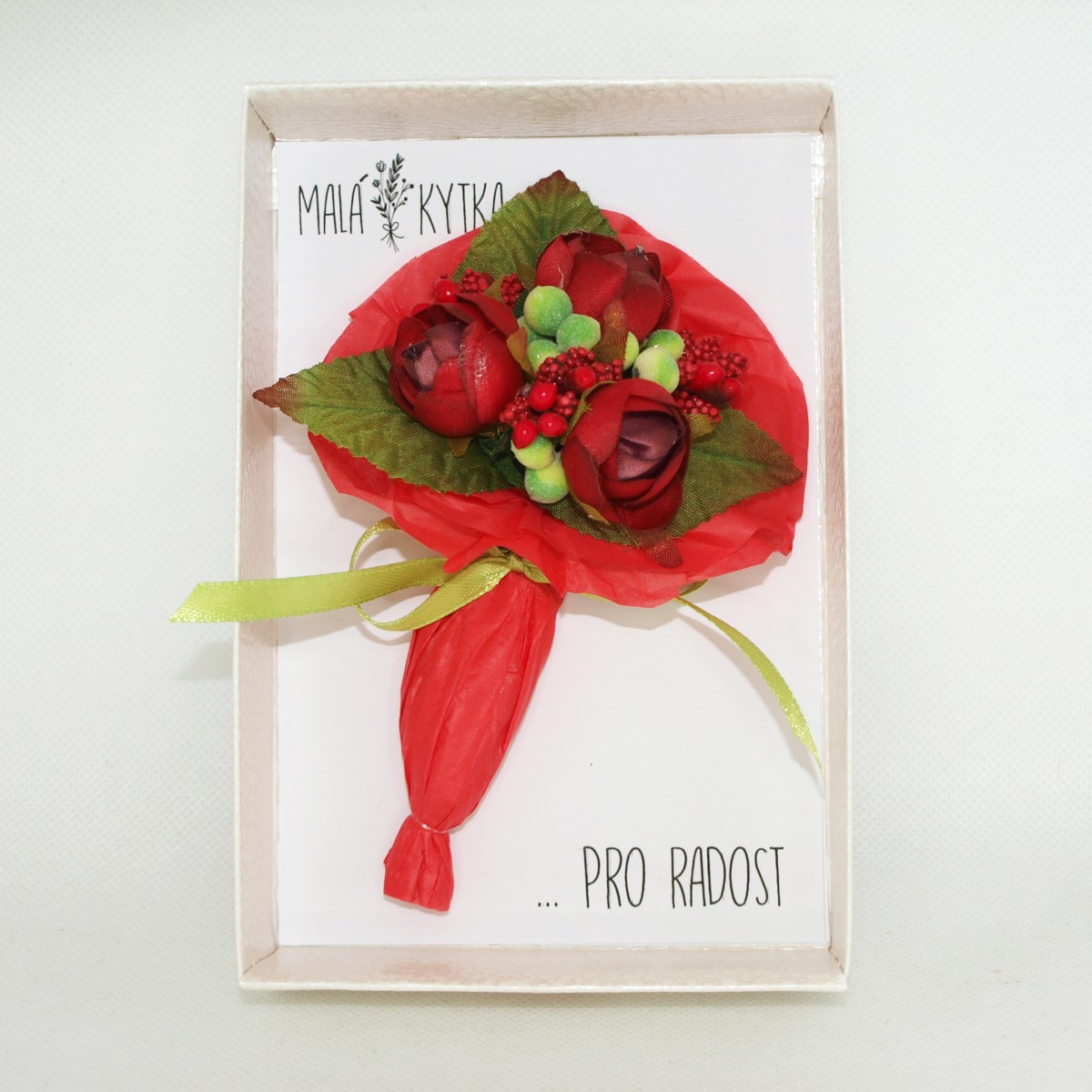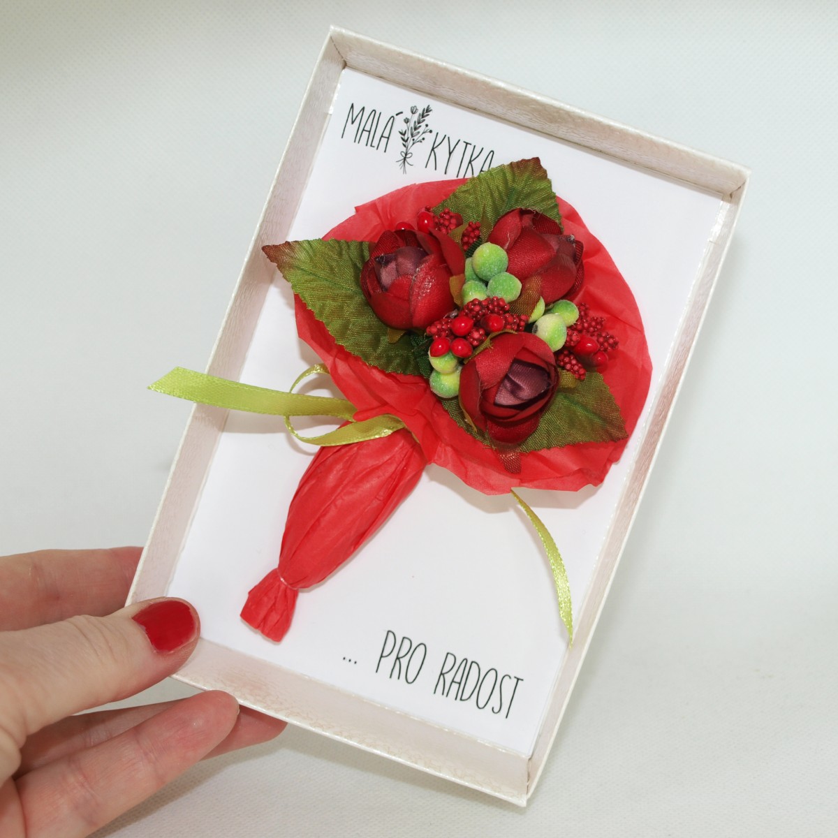 Malá kytka... mini kytička v papírové krabiččce v imitaci bílé kůže, s průhledným uzavíráním. Kytička je vytvořena z čistě přírodních materiálů, převážně z papíru a hedvábí. Je to ideální "maličkost pro radost" k různým příležitostem, ať už pro potěšení kamarádce, mamince, babičce, pro paní doktorku, učitelku, do porodnice, nebo komukoliv, komu chcete poděkovat, potěšit. je to maličkost, která potěší, ale nezavazuje. Dá se také poslat v bublinkové obálce jako psaní, komukoliv, když nemůžete předat osobně. Stačí napsat a my vše zařídíme za vás...