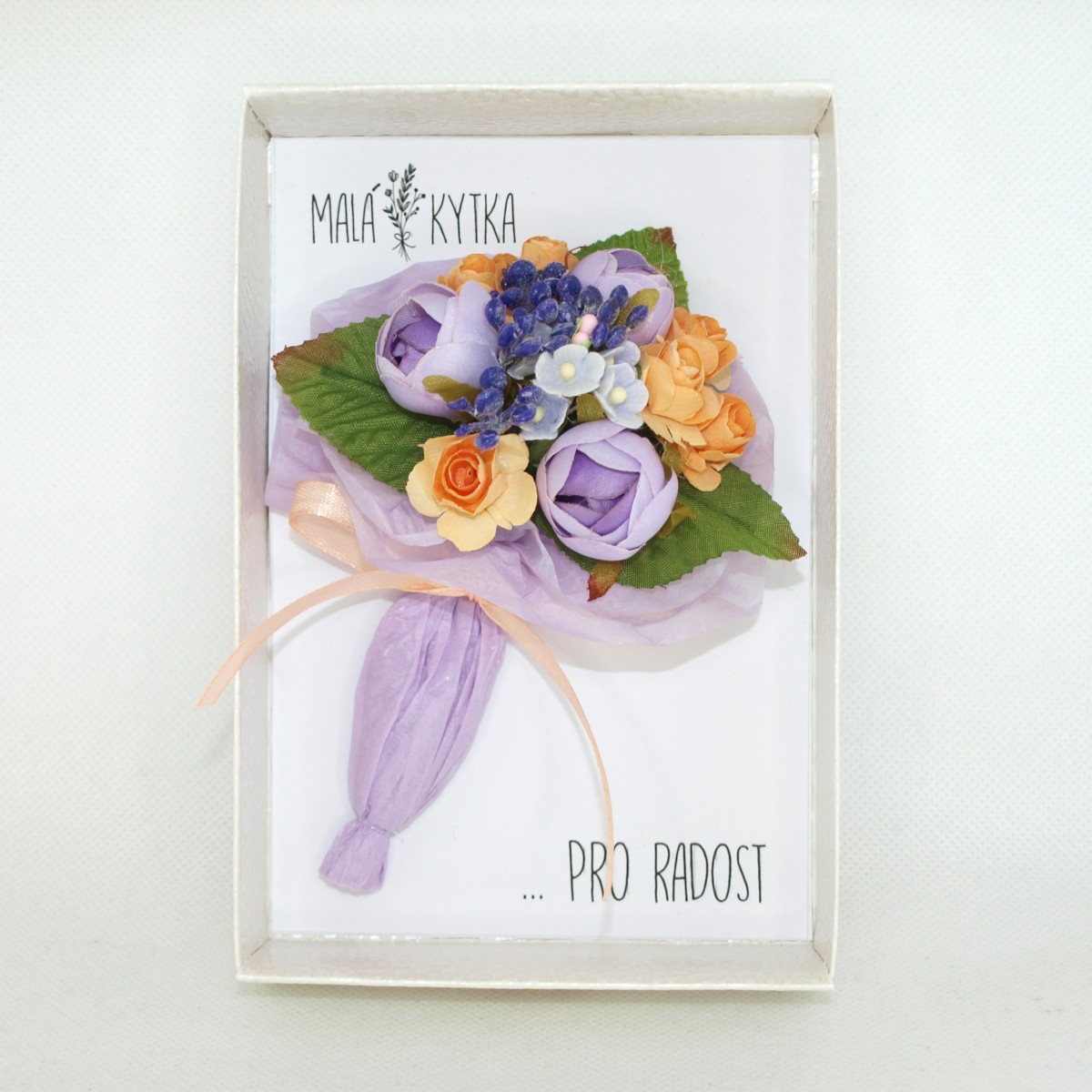 Malá kytka... mini kytička v papírové krabiččce v imitaci bílé kůže, s průhledným uzavíráním. Kytička je vytvořena z čistě přírodních materiálů, převážně z papíru a hedvábí. Je to ideální "maličkost pro radost" k různým příležitostem, ať už pro potěšení kamarádce, mamince, babičce, pro paní doktorku, učitelku, do porodnice, nebo komukoliv, komu chcete poděkovat, potěšit. je to maličkost, která potěší, ale nezavazuje. Dá se také poslat v bublinkové obálce jako psaní, komukoliv, když nemůžete předat osobně. Stačí napsat a my vše zařídíme za vás...