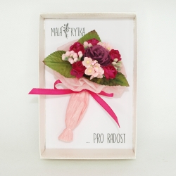 Malá kytka... mini kytička v papírové krabiččce v imitaci bílé kůže, s průhledným uzavíráním. Kytička je vytvořena z čistě přírodních materiálů, převážně z papíru a hedvábí. Je to ideální "maličkost pro radost" k různým příležitostem, ať už pro potěšení kamarádce, mamince, babičce, pro paní doktorku, učitelku, do porodnice, nebo komukoliv, komu chcete poděkovat, potěšit. je to maličkost, která potěší, ale nezavazuje. Dá se také poslat v bublinkové obálce jako psaní, komukoliv, když nemůžete předat osobně. Stačí napsat a my vše zařídíme za vás...
