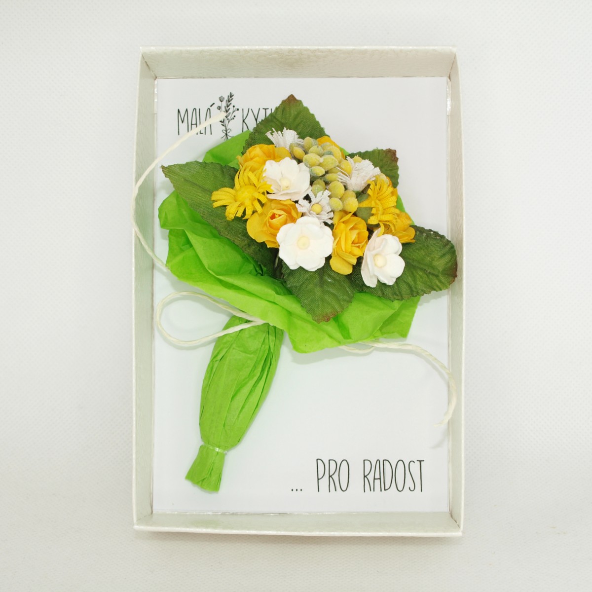 Malá kytka... mini kytička v papírové krabiččce v imitaci bílé kůže, s průhledným uzavíráním. Kytička je vytvořena z čistě přírodních materiálů, převážně z papíru a hedvábí. Je to ideální "maličkost pro radost" k různým příležitostem, ať už pro potěšení kamarádce, mamince, babičce, pro paní doktorku, učitelku, do porodnice, nebo komukoliv, komu chcete poděkovat, potěšit. je to maličkost, která potěší, ale nezavazuje. Dá se také poslat v bublinkové obálce jako psaní, komukoliv, když nemůžete předat osobně. Stačí napsat a my vše zařídíme za vás...