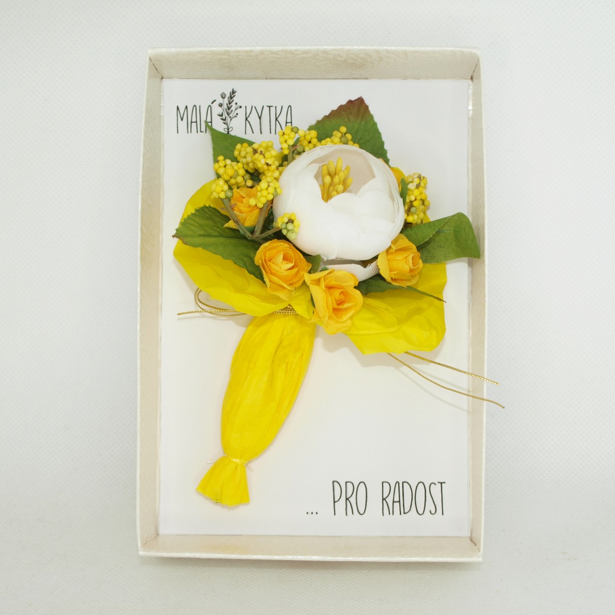 Malá kytka... mini kytička v papírové krabiččce v imitaci bílé kůže, s průhledným uzavíráním. Kytička je vytvořena z čistě přírodních materiálů, převážně z papíru a hedvábí. Je to ideální "maličkost pro radost" k různým příležitostem, ať už pro potěšení kamarádce, mamince, babičce, pro paní doktorku, učitelku, do porodnice, nebo komukoliv, komu chcete poděkovat, potěšit. je to maličkost, která potěší, ale nezavazuje. Dá se také poslat v bublinkové obálce jako psaní, komukoliv, když nemůžete předat osobně. Stačí napsat a my vše zařídíme za vás...