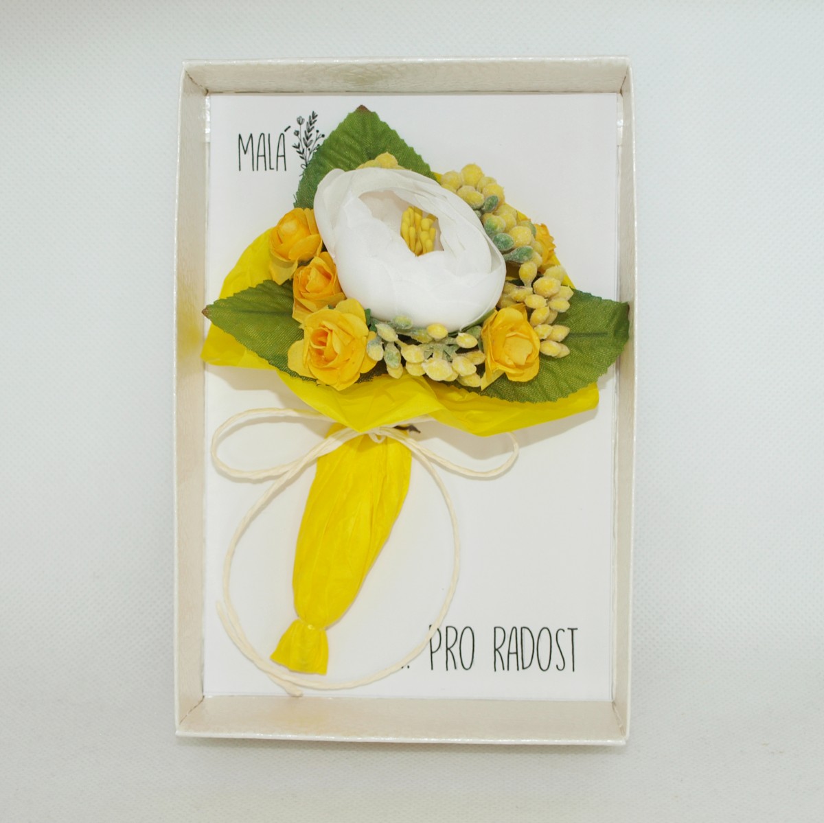 Malá kytka... mini kytička v papírové krabiččce v imitaci bílé kůže, s průhledným uzavíráním. Kytička je vytvořena z čistě přírodních materiálů, převážně z papíru a hedvábí. Je to ideální "maličkost pro radost" k různým příležitostem, ať už pro potěšení kamarádce, mamince, babičce, pro paní doktorku, učitelku, do porodnice, nebo komukoliv, komu chcete poděkovat, potěšit. je to maličkost, která potěší, ale nezavazuje. Dá se také poslat v bublinkové obálce jako psaní, komukoliv, když nemůžete předat osobně. Stačí napsat a my vše zařídíme za vás...