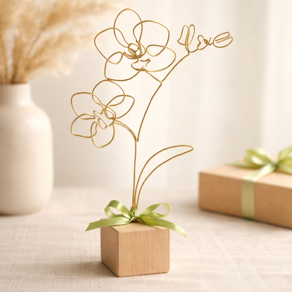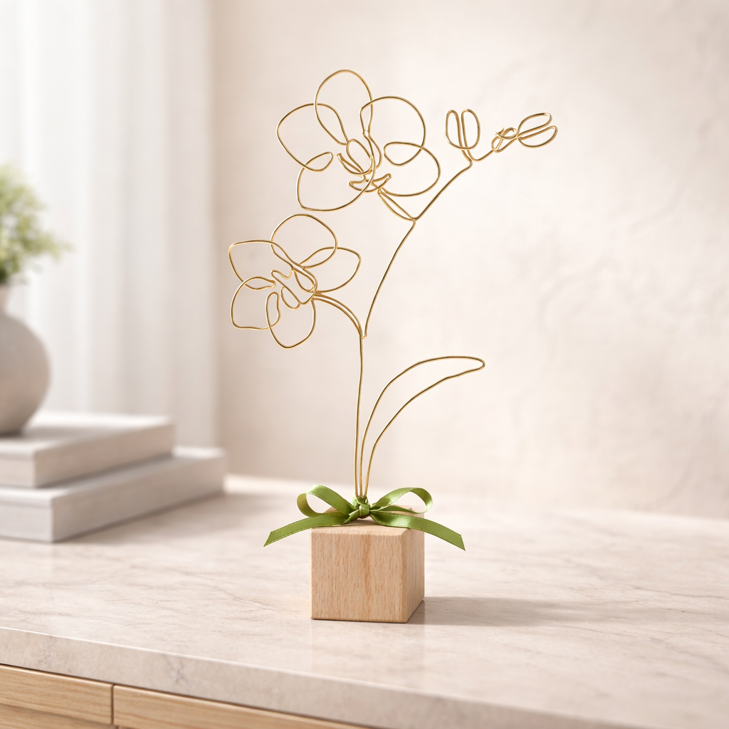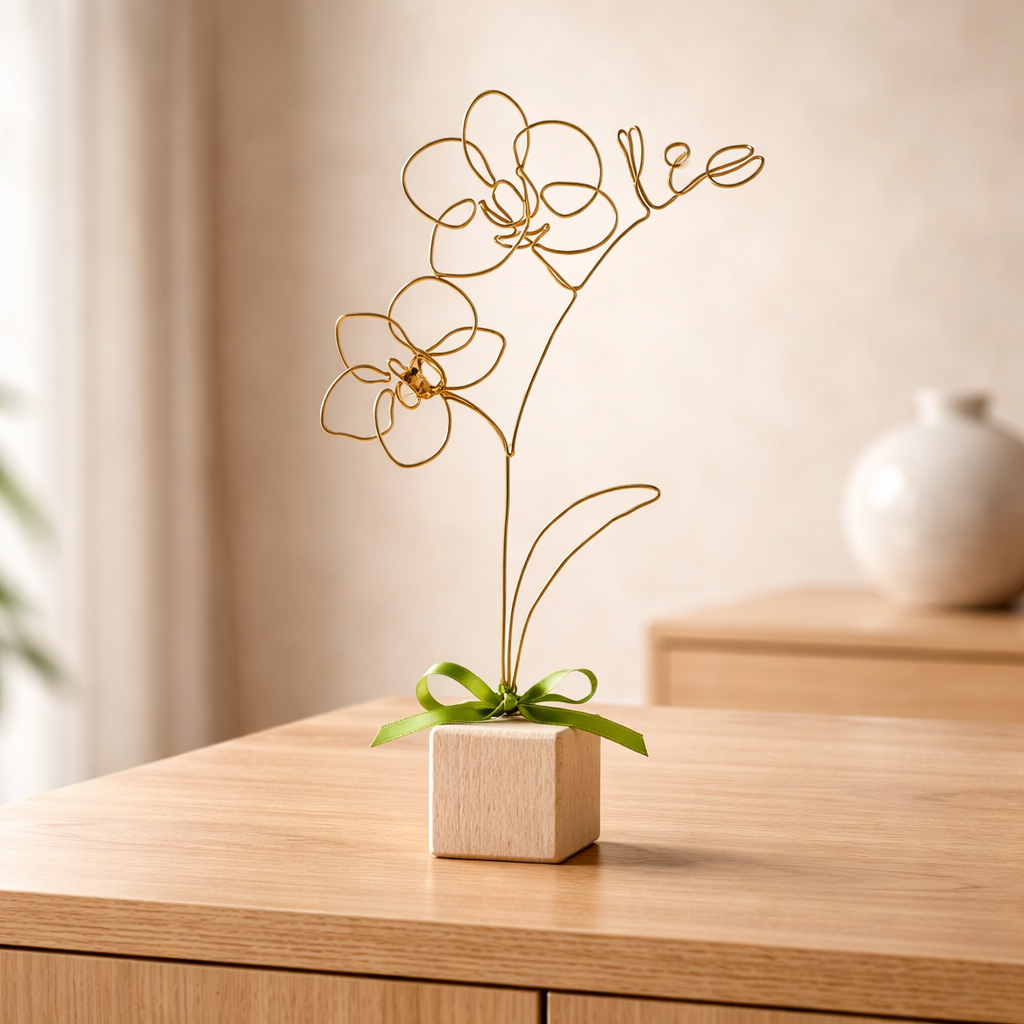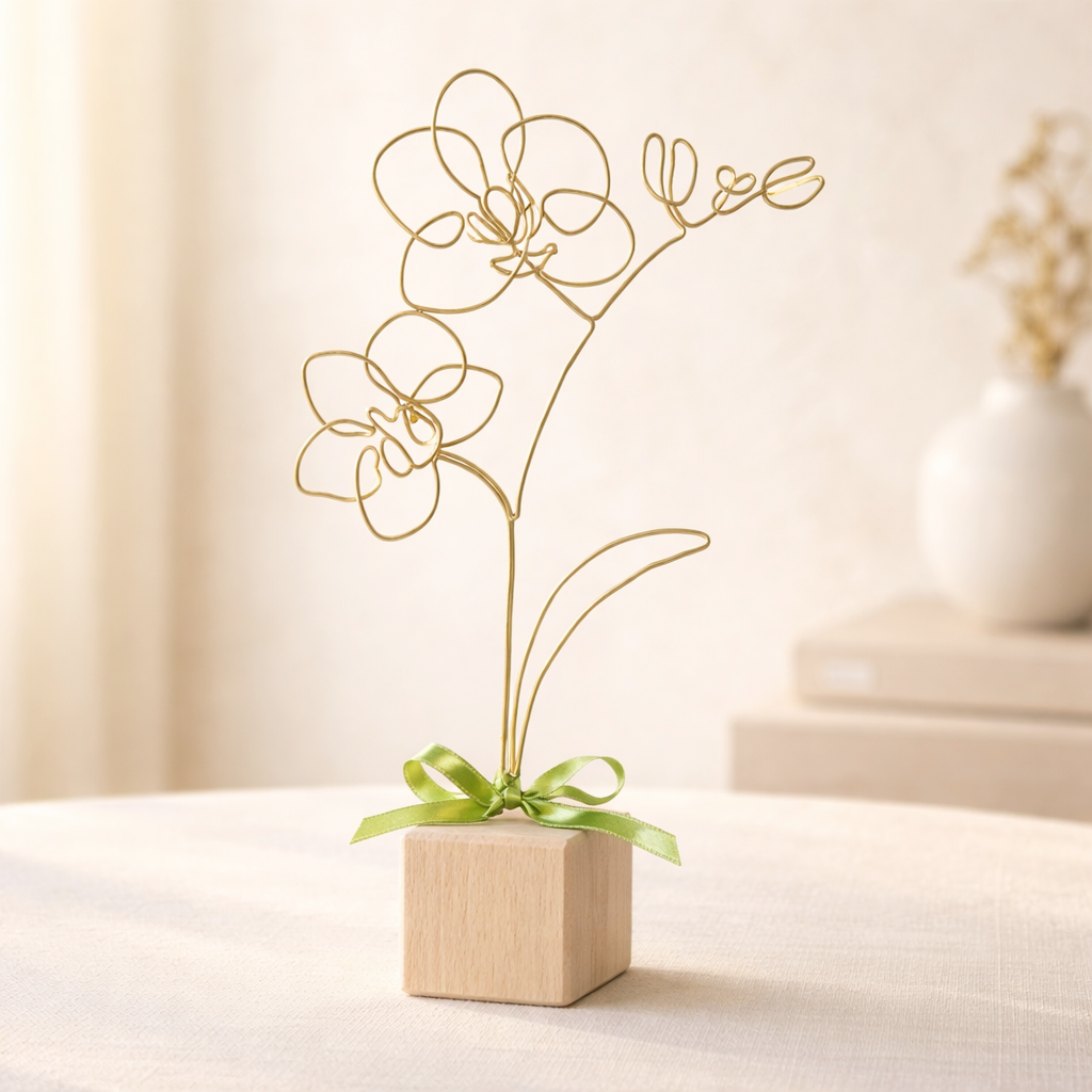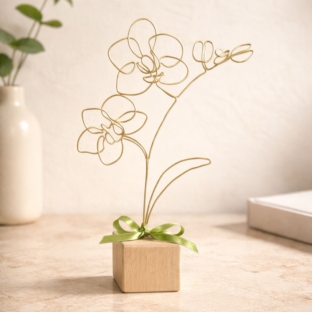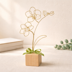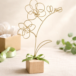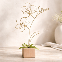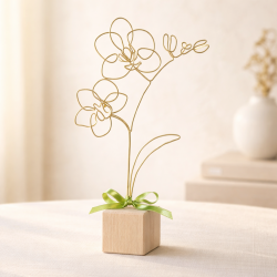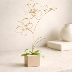Orchidej je připevněna na dřevěné kostce a tvoří tak samostatně stojící dekoraci. Dozdobena je stuhou.