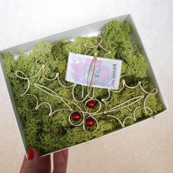 Co ták darovat peníze v luxusní dárkové krabičce v imitace bílé kůže, s průhledným víčkem, kde hraje hlavní roli krásná dekorace vánoční cesmíny, kde můžete peníze vložit ať už v maličké obálce, nebo jen tak... Dekorace zůstane napořád, ať už na vánoční stůl, nebo svícen. Krabička je vystlána přírodním mechem.