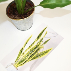 Výška zápichu je cca 26 cm. Zabalen je na kartě z tvrdého kartonu v rozměru 29 x 14 cm s motivem pokojové květiny v akvarelu.