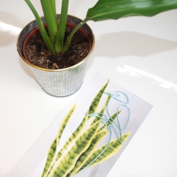 Výška zápichu je cca 26 cm. Zabalen je na kartě z tvrdého kartonu v rozměru 29 x 14 cm s motivem pokojové květiny v akvarelu.