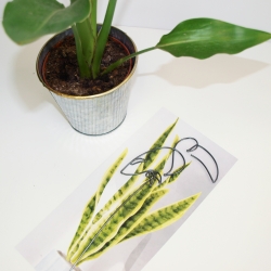Výška zápichu je cca 26 cm. Zabalen je na kartě z tvrdého kartonu v rozměru 29 x 14 cm s motivem pokojové květiny v akvarelu.