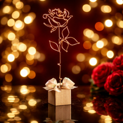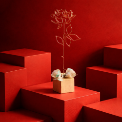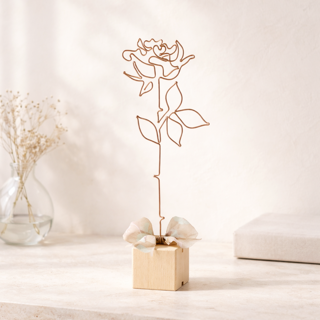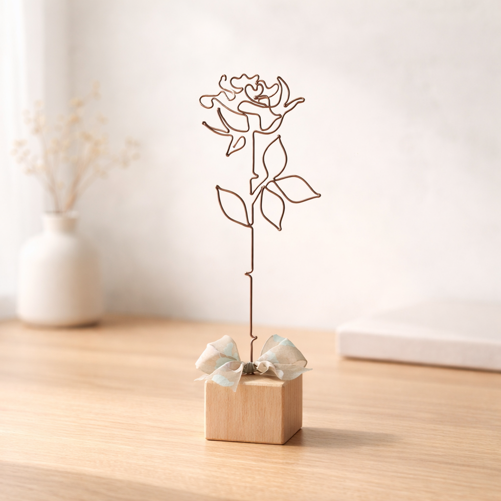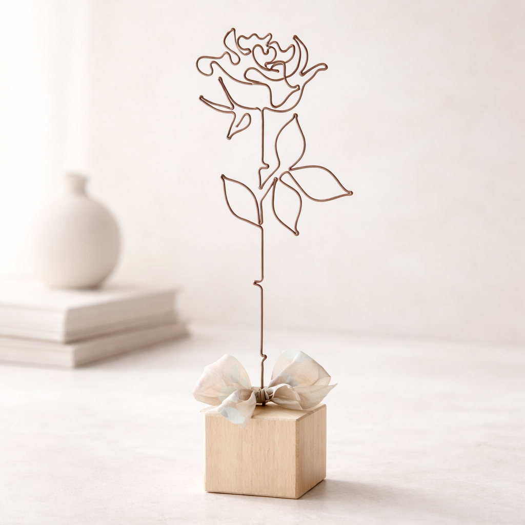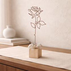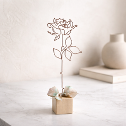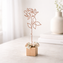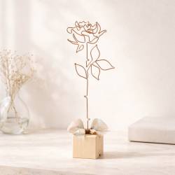 Růže je připevněna na dřevěné kostce a tvoří tak samostatně stojící dekoraci. Dostdobena je stuhou.
