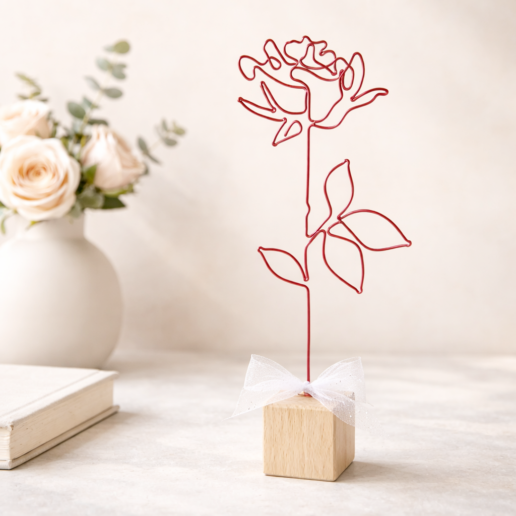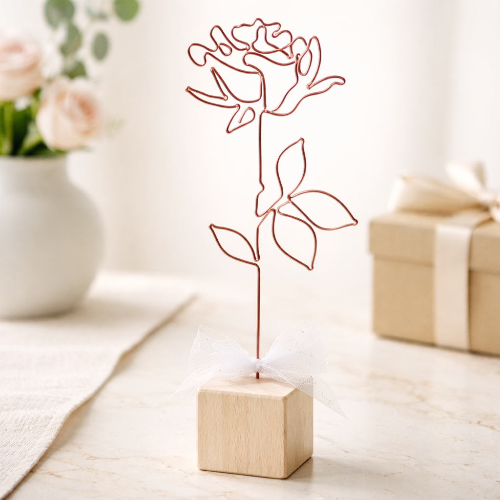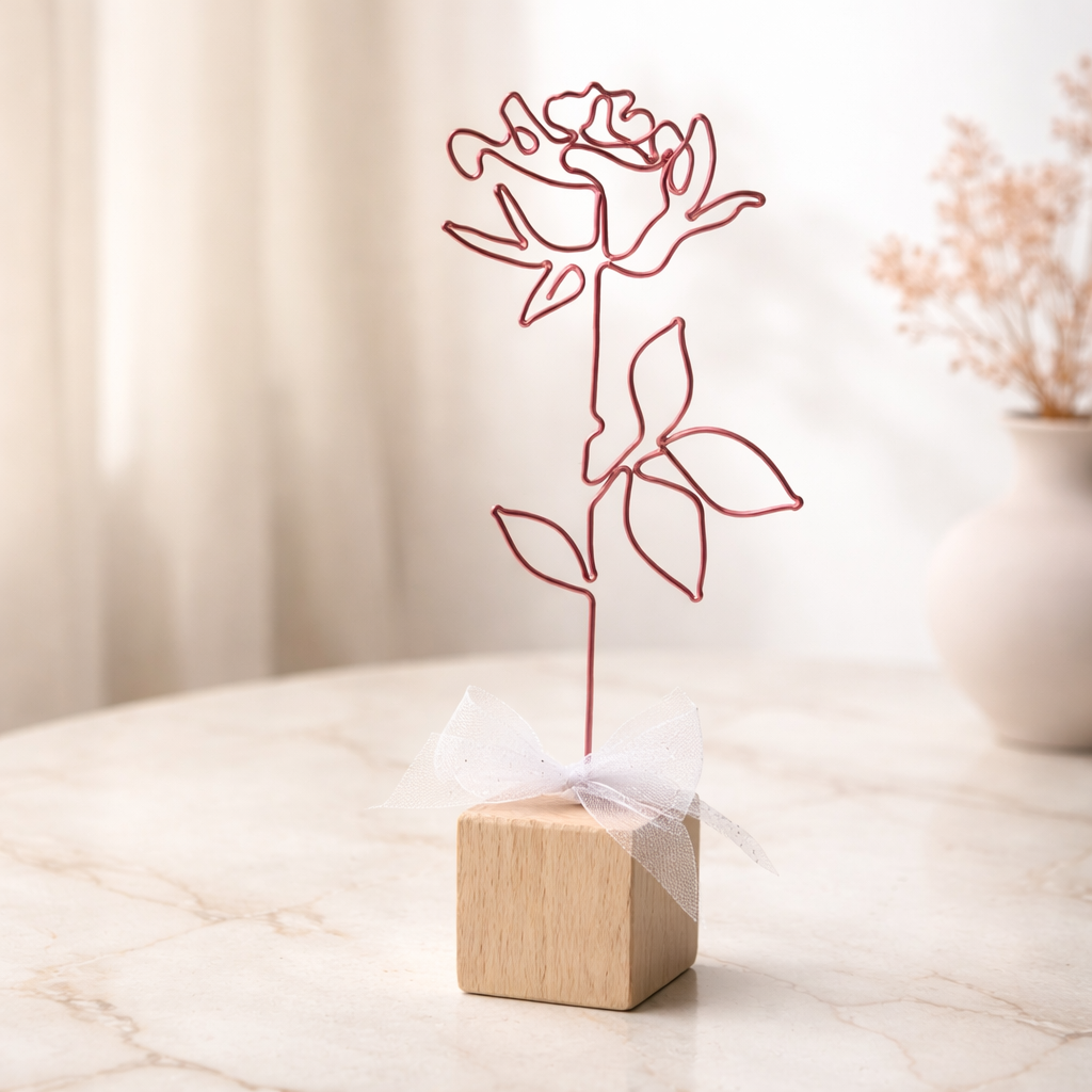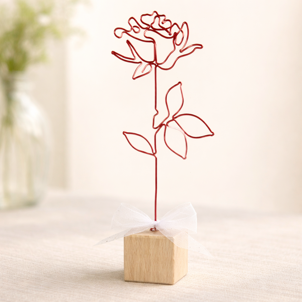 Růže je připevněna na dřevěné kostce a tvoří tak samostatně stojící dekoraci. Dostdobena je stuhou.