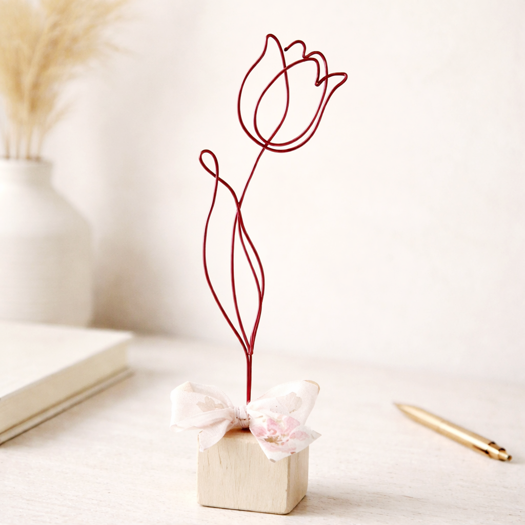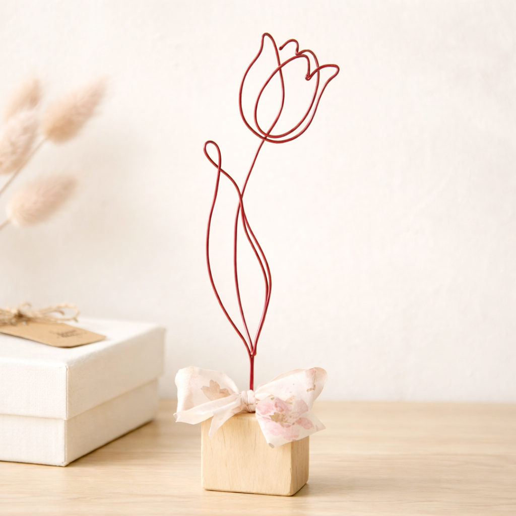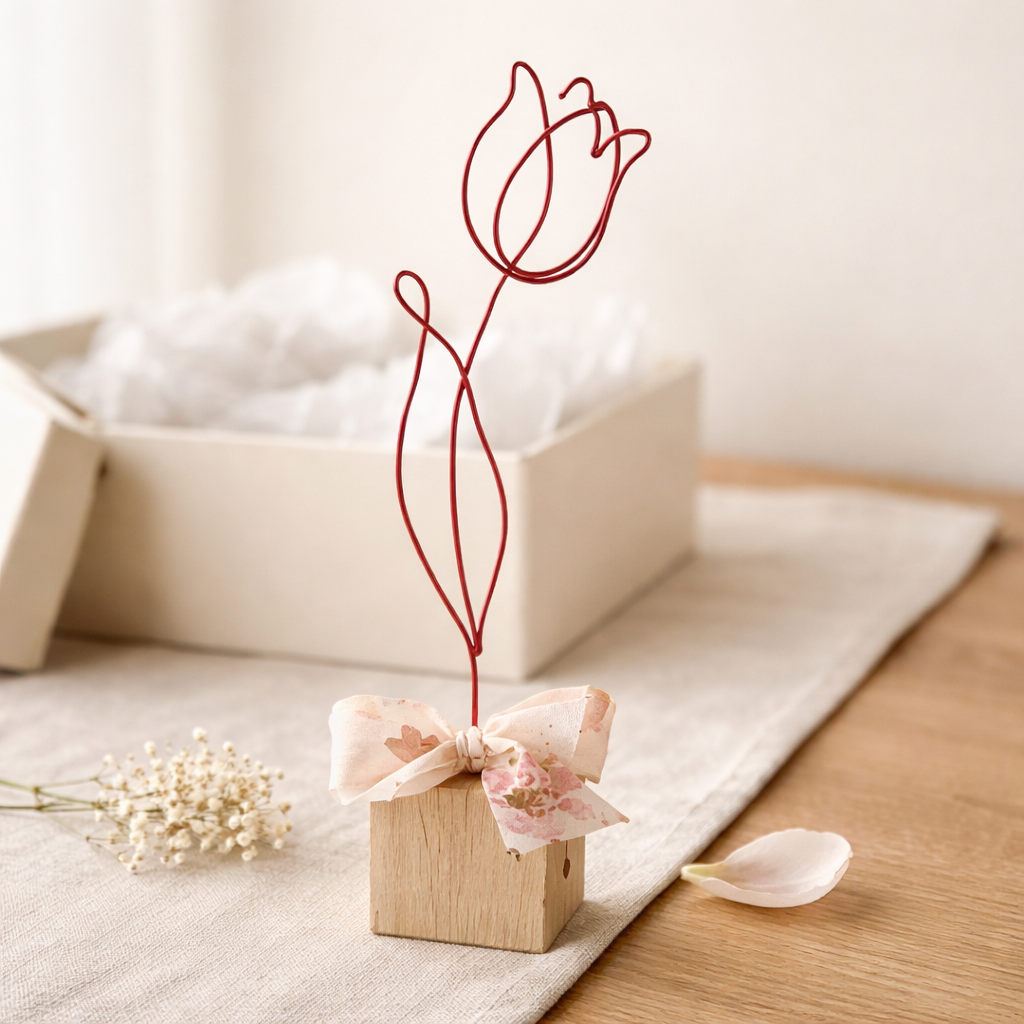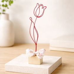 Tulipán je připevněn na drevěné kostce, doplněno stuhou a tvoří tak samostatně stojící dekoraci.
