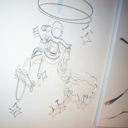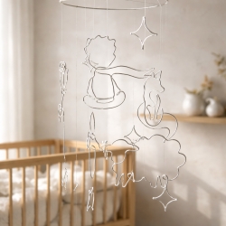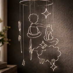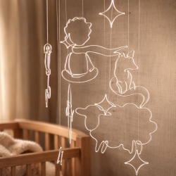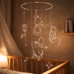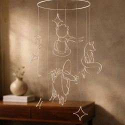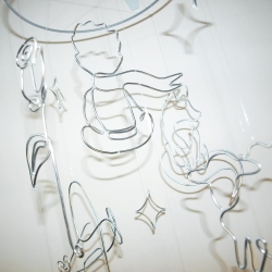 Uprostřed je Malý princ a kolem něj nejznámější symboly... růže, letadlo, liška a beránek. Doplněno je hvězdičkami.