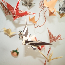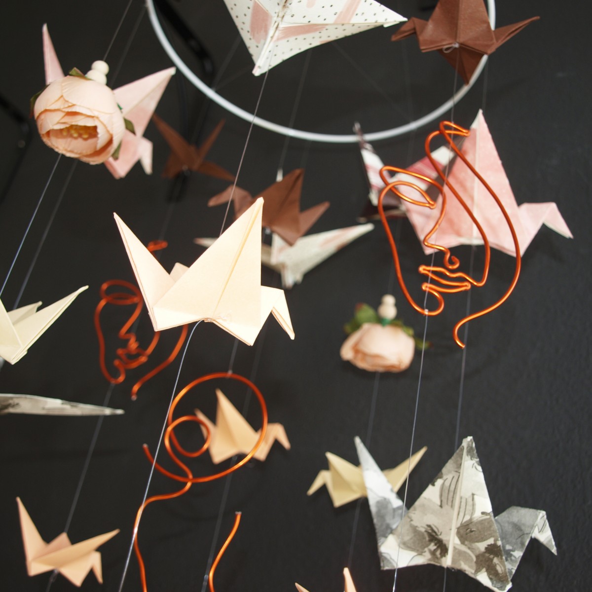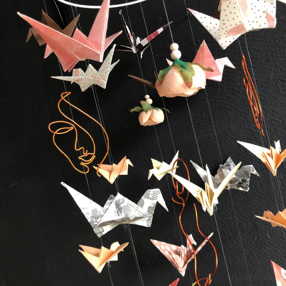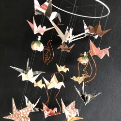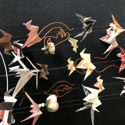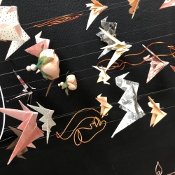 Doplněna je papírovými jeřáby origami, v odstínech šedé a meruňkové, dřevěnými korálkami a zakončené meruňkovými pivoňkami, které jsou dominantní.