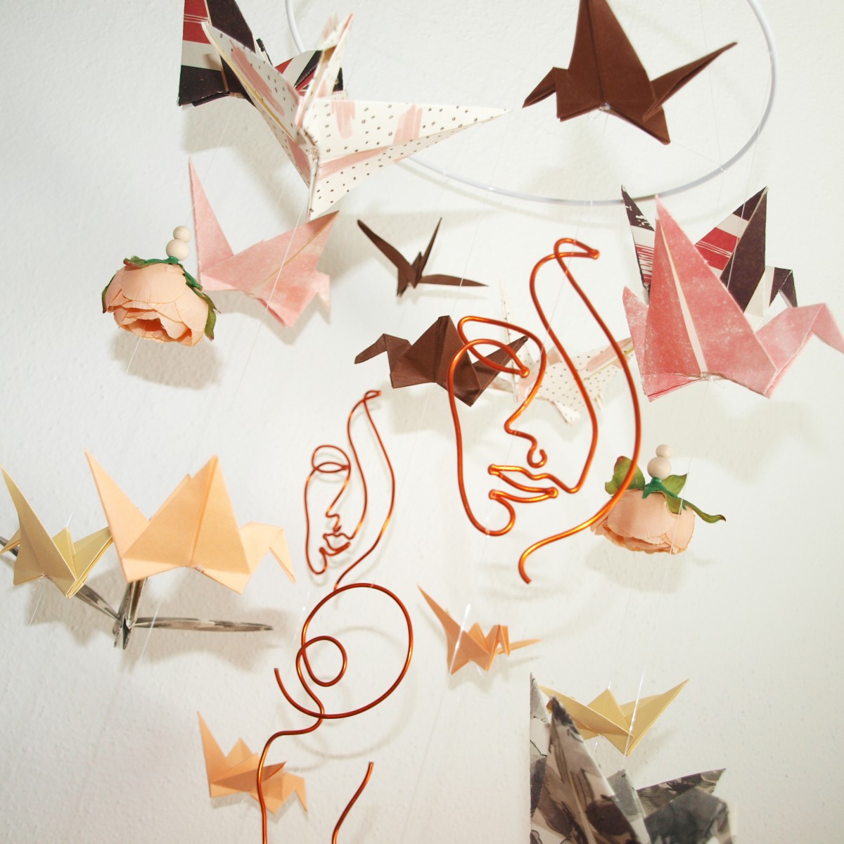 Závěsná dekorace v odstínech měděné, šedé a meruňkové, s kovovými prvky v měděném drátu - tváře ženy.