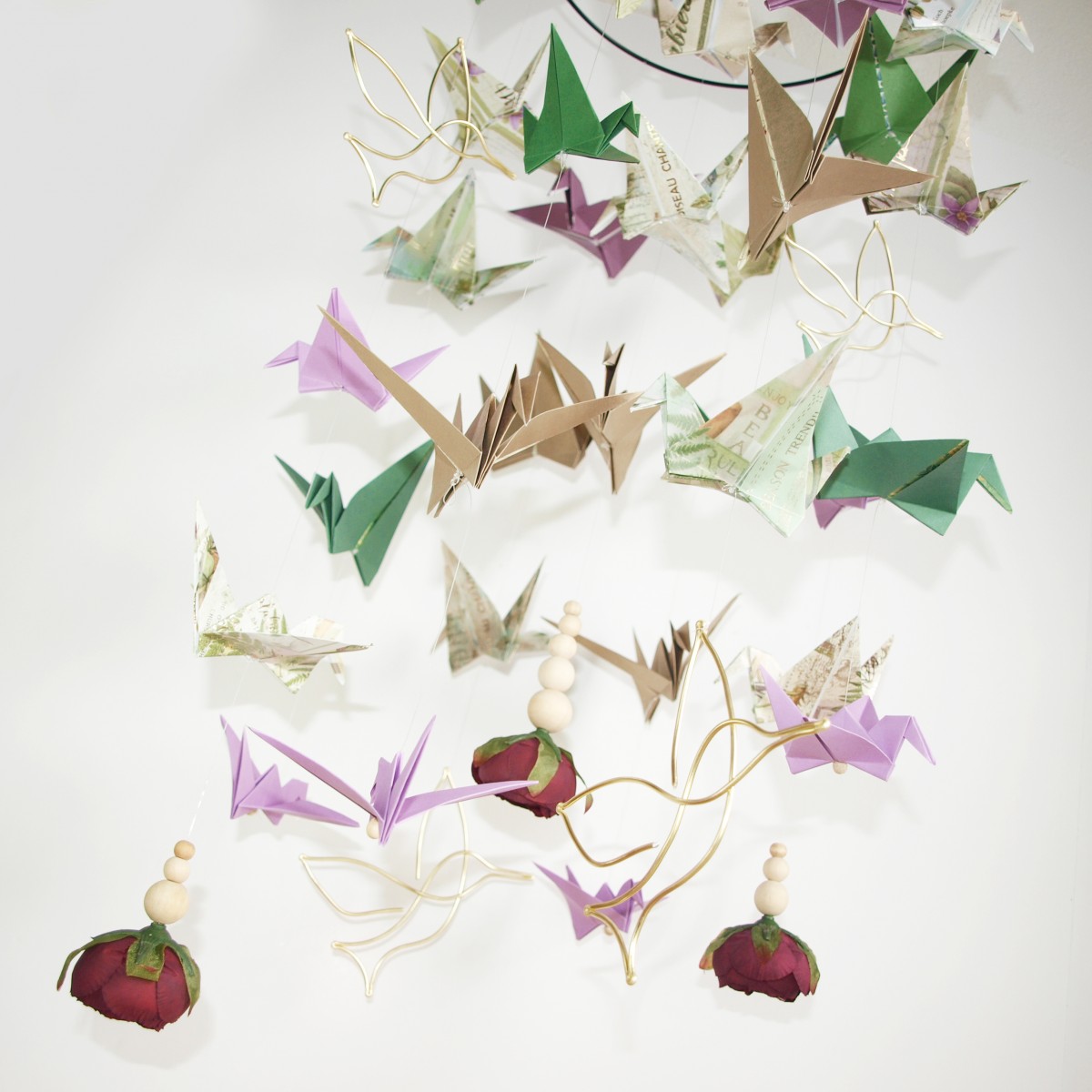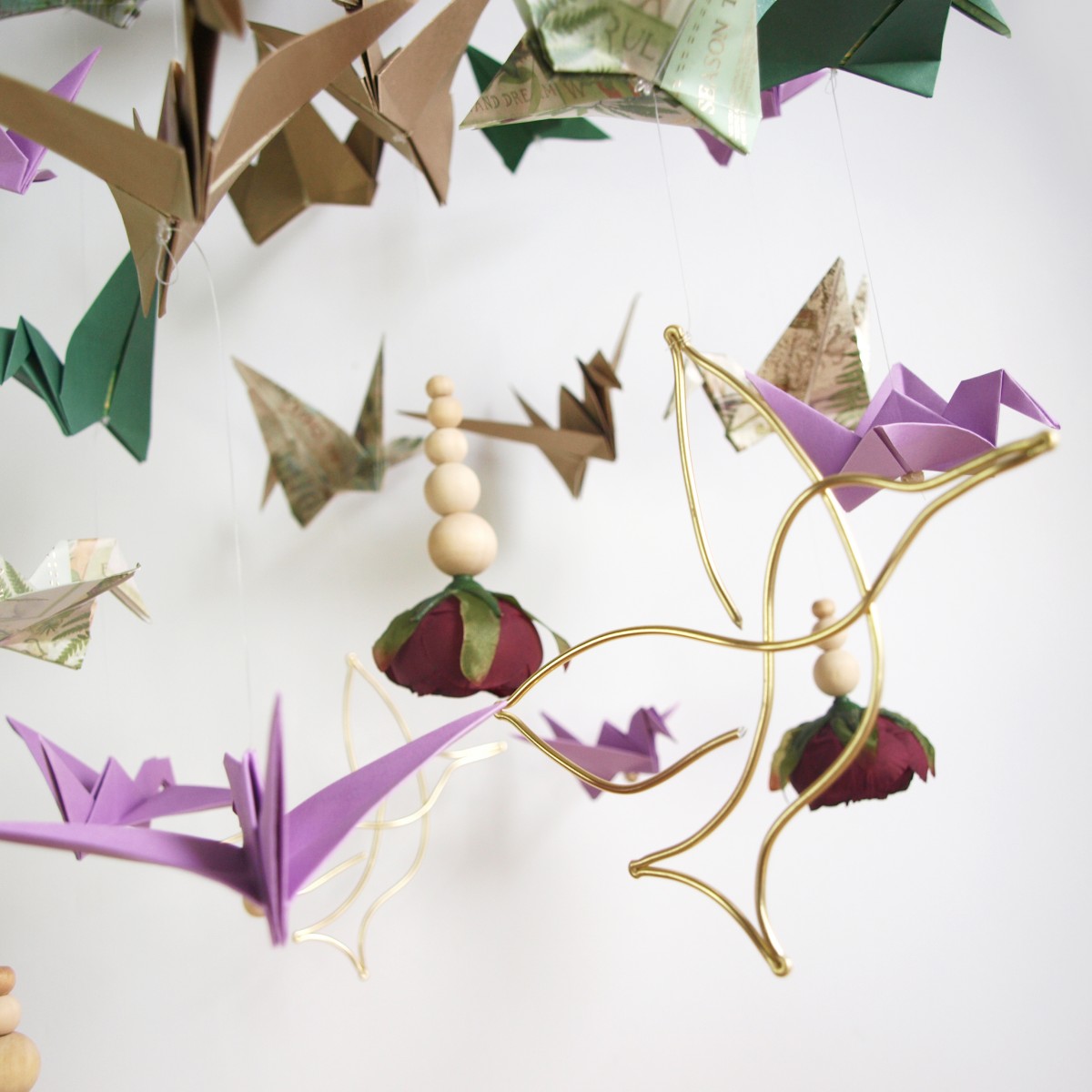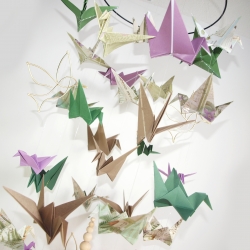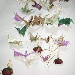 Doplněna je papírovými jeřáby origami, v odstínech přírodní, zelené, fialové, s dřevěnými korálkami a zakončené temně fialovými pivoňkami.